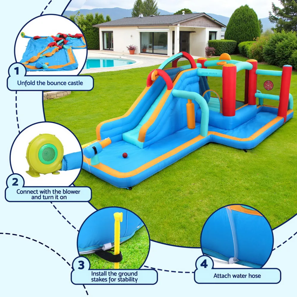 Kids water park with slide, trampoline, climbing wall and water cannon