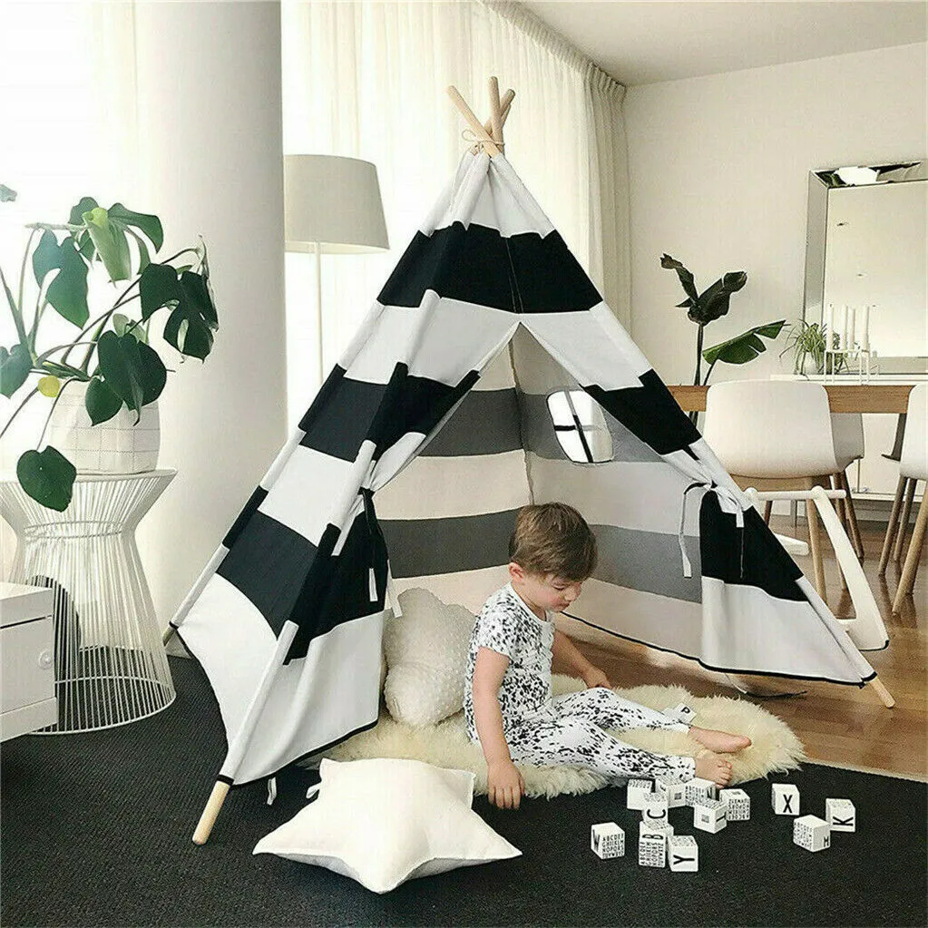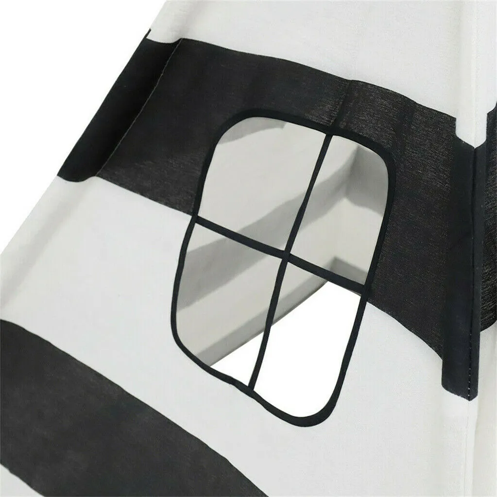 Kids Teepee Tent Linen Wood Black White Stripe Playhouse Indoor Garden