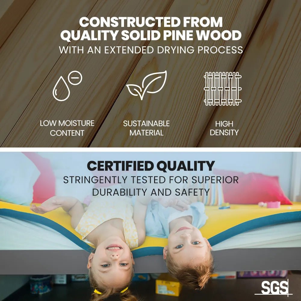 This Kingston Slumber Bed Frame Bunk Bed is crafted from solid high-quality sustainably sourced timber and is compatible with standard Australian single sized mattresses. Safety is paramount with SGS-certified quality, rigorously tested for superior durability. The bed features durable plywood slats, an extra-reinforced frame, and a solid, secure ladder. It even features an exclusive toy shelf which is sure to be a nice home for their favourites.