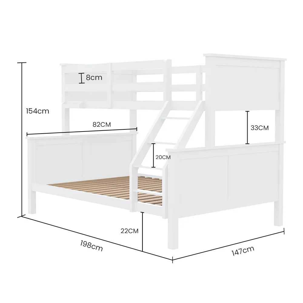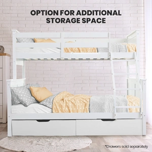 The Kingston Slumber Triple Bunk Bed Frame is crafted from solid high-quality sustainably sourced timber and is compatible with standard Australian single and double sized mattresses. Safety is paramount with SGS-certified quality, rigorously tested for superior durability. The bed features durable plywood slats and a solid, secure ladder. It even features an exclusive toy shelf which is sure to be a nice home for their favourites.