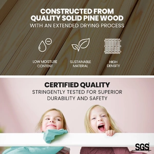Crafted with premium pinewood slats, this bed frame ensures durability and stability. The extended drying process of the frame guarantees long-lasting quality. With a 120kg capacity, the bed provides a safe and comfortable sleep space for your child.