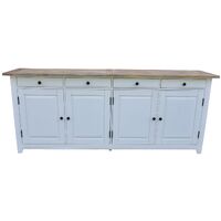 This beautiful storage cabinet gives your living room the perfection and cleanliness it deserves. With 4 doors, covering sizable compartments and 4 drawers, it offers great functionality. All the drawers have full-extension metal runners, black metal handles, and white painted interiors. Crafted beautifully, the multi-coloured buffet features a lightly stained natural timber top, contrasted with white painted legs. The two-tone furniture piece looks gorgeous in a variety of interior decor styles. Designed by using the elements of a combination of styles, including Hampton, Coastal, Modern Farmhouse, and French Provincial, the buffet exudes perfection effortlessly. It is made of sustainably harvested, solid mango wood using traditional construction techniques that ensure perfect cuts and an impeccable shape to suit your taste. The wood makes the buffet strong and durable while providing water and heat resistance. A one-year warranty is included with the fully assembled buffet.