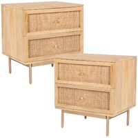 This 2-drawer bedside is a furniture masterpiece displaying the beauty of natural aesthetics. It is a versatile storage case designed in the contemporary style that looks lovely in the bedroom. Made of sustainably harvested mango wood, the furniture piece has gorgeous rattan weave on the drawer fronts. Mango wood is valued for its robustness, longevity, and resistance to mould or moisture. The full-extension metal runner and brass powder coated metal handles on the sizable drawers add to the practical functionality of the bedside. Strong metal legs provide a sturdy base for the furniture. Due to natural colour, the furniture piece brings a sense of cosiness and warmth to your bedroom, and it complements diverse interior decor styles or bed designs. The easy-to-assemble furniture comes with a one-year warranty.
