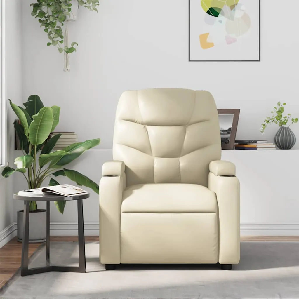 Sit back and drift away in this highly comfortable massage recliner chair! Manual reclining function: This reclining chair has a handle on the right side. You can manually adjust the footrest and the backrest to any position as per your comfort with a simple pull of the handle. This feature allows for a maximum tilt of 135 degrees. Additionally, the backrest can go quickly back to the original place with an easy pull of the handle.Vibration function: The featured 6 massage points let you experience a better-targeted massage. Additionally, the included hand control allows you to pick different massage programs. The massage function is powered by the USB connector, but the certified 5V USB power source is not included.Comfortable seat experience: The thickly padded seat, backrest, and wide armrests covered in faux leather provide a cosy sensation, making you feel embraced while seated. The faux leather is a highly durable material. It is resistant to stain, making it easy to clean with a damp cloth. The smooth surface also gives a luxurious look and the beauty of real leather.Convenient cup holders and side pocket: This armchair has two convenient cup holders for your drinks and a side pocket for your remote control or keeping your essential items within easy reach.Solid and stable frame: The frame made of wood and metal provides a strong structure and stability. This reclining armchair is comfortable and durable.