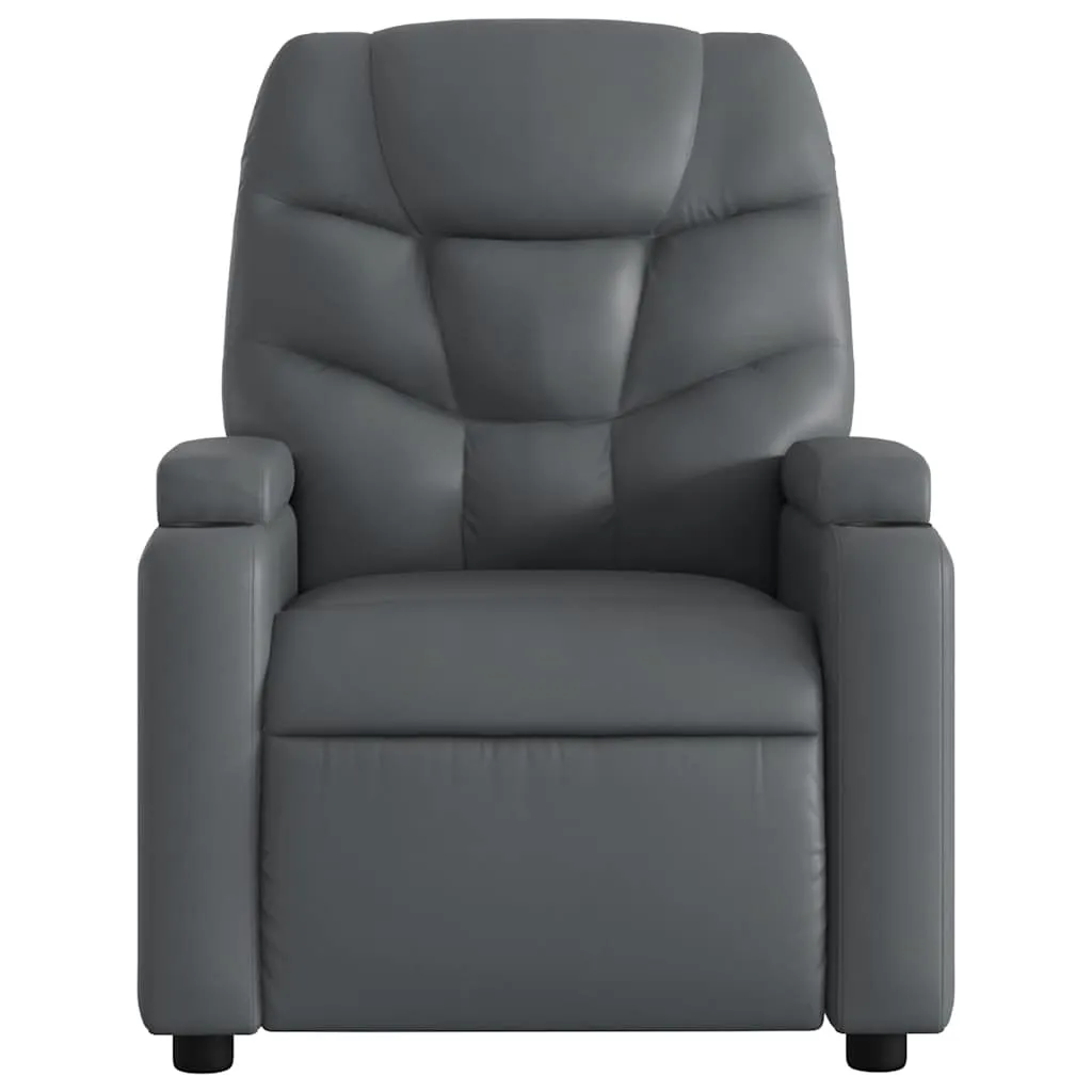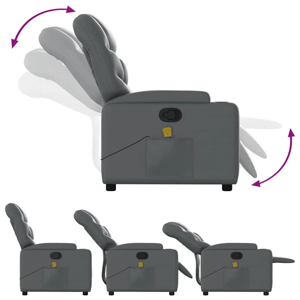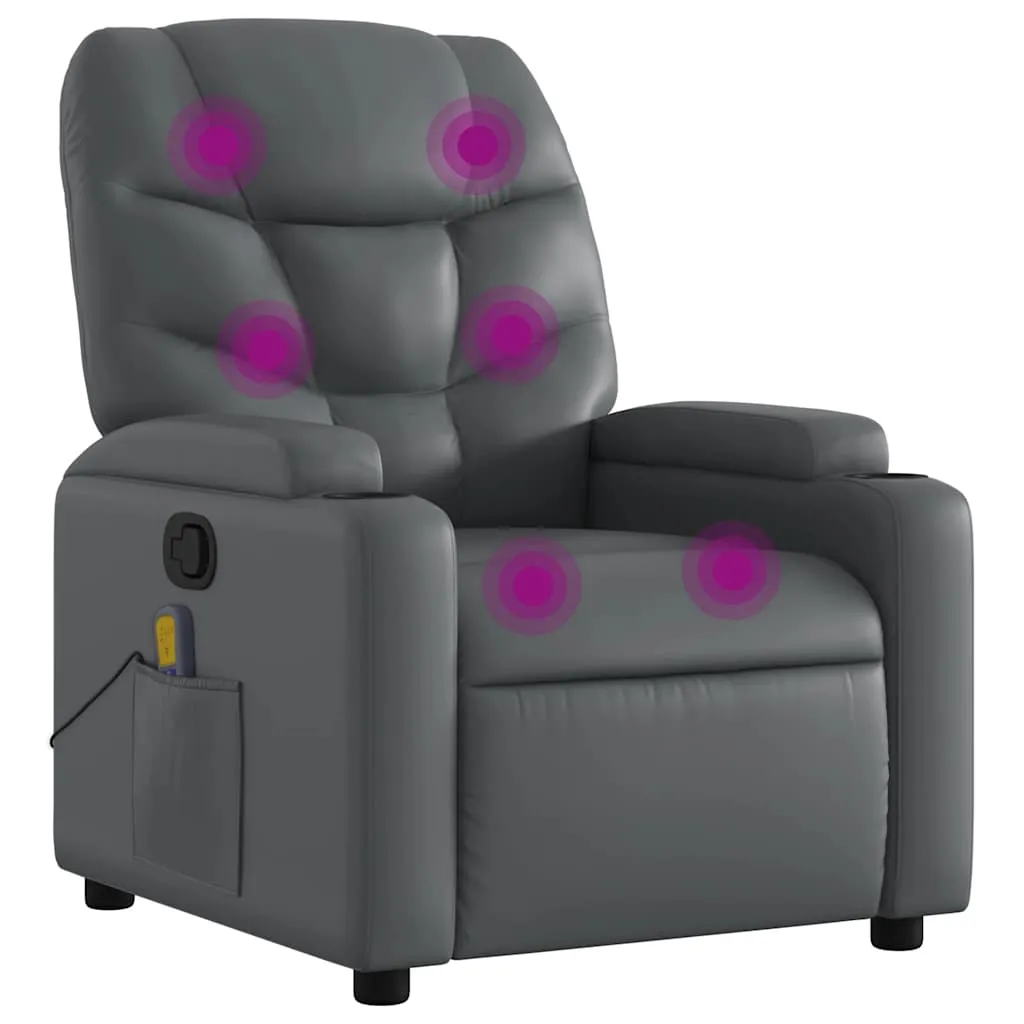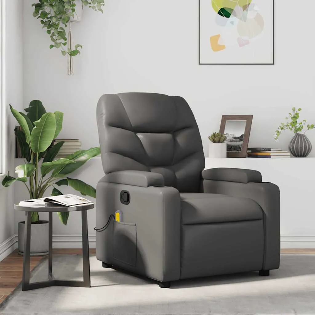 Sit back and drift away in this highly comfortable massage recliner chair! Manual reclining function: This reclining chair has a handle on the right side. You can manually adjust the footrest and the backrest to any position as per your comfort with a simple pull of the handle. This feature allows for a maximum tilt of 135 degrees. Additionally, the backrest can go quickly back to the original place with an easy pull of the handle.Vibration function: The featured 6 massage points let you experience a better-targeted massage. Additionally, the included hand control allows you to pick different massage programs. The massage function is powered by the USB connector, but the certified 5V USB power source is not included.Comfortable seat experience: The thickly padded seat, backrest, and wide armrests covered in faux leather provide a cosy sensation, making you feel embraced while seated. The faux leather is a highly durable material. It is resistant to stain, making it easy to clean with a damp cloth. The smooth surface also gives a luxurious look and the beauty of real leather.Convenient cup holders and side pocket: This armchair has two convenient cup holders for your drinks and a side pocket for your remote control or keeping your essential items within easy reach.Solid and stable frame: The frame made of wood and metal provides a strong structure and stability. This reclining armchair is comfortable and durable.