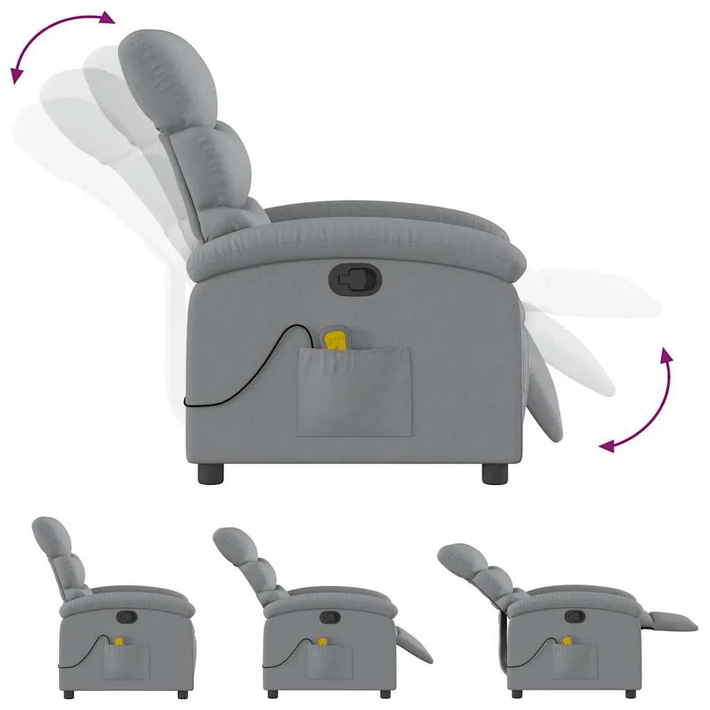 Sit back and drift away in this highly comfortable massage recliner chair! Manual reclining function: This reclining chair has a handle on the right side. You can manually adjust the footrest and the backrest to any position as per your comfort with a simple pull of the handle. This feature allows for a maximum tilt of 135 degrees. Additionally, the backrest can go quickly back to the original place with an easy pull of the handle.Vibration function: The featured 6 massage points let you experience a better-targeted massage. Additionally, the included hand control allows you to pick different massage programs. The massage function is powered by the USB connector, but the certified 5V USB power source is not included.Comfortable seat experience: The thickly padded seat, backrest, and wide armrests covered in fabric provide a cosy and warm sensation, making you feel embraced while seated. The fabric features a simple and clean look and is breathable and durable.Convenient side pocket: This armchair has a side pocket for your remote control or keeping your essential items within easy reach.Solid and stable frame: The frame made of wood and metal provides a strong structure and stability. This reclining armchair is comfortable and durable.