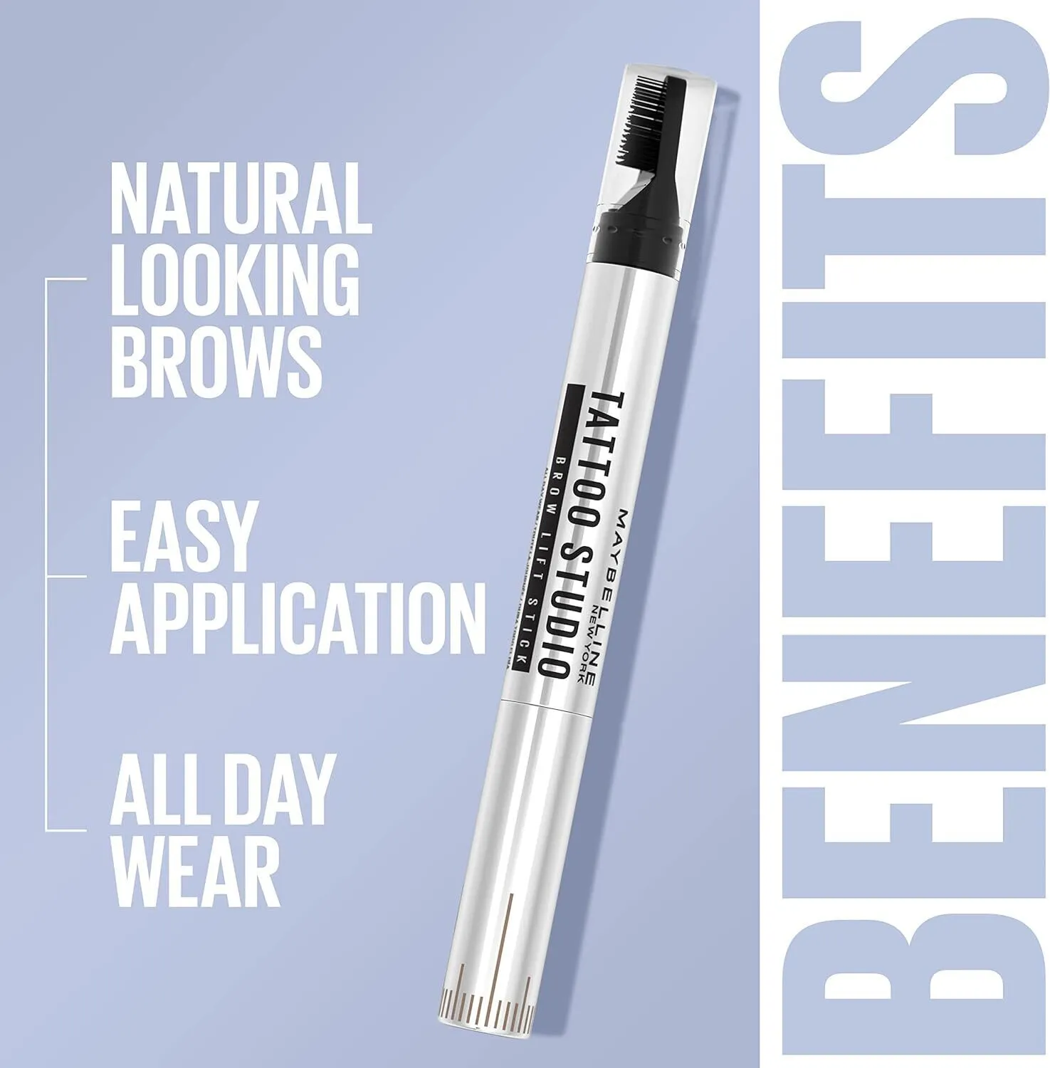 Maybelline Tattoo Studio Brow Lift Stick is long-lasting formula for all-day wear. Clear brow lift stick for defined and lifted brows. Easy-to-use twist-up design for precise application. Instantly shapes and tames unruly brows. Transparent finish suitable for all brow colors. Waterproof and smudge-proof for a lasting look. Adds volume and definition to sparse brows. Ideal for achieving a polished and natural brow look. Compact size for on-the-go touch-ups. Dermatologist-tested and suitable for sensitive skin.