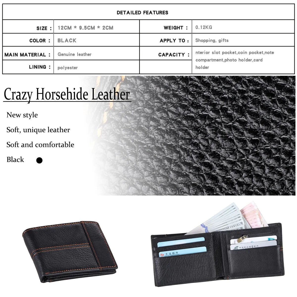 Internal structure: 10 * Card Slots, 1* zipper coin pockets , 1* big cash pocket