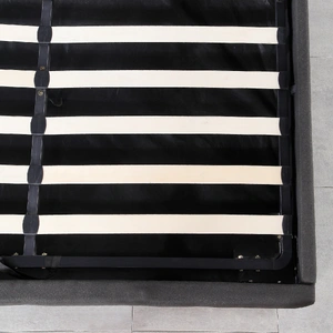 This bed frame and the complementary headboard is encased in a tufted, high-quality linen fabric upholstery with clean and smooth edges that complement the modern design and adds another layer of comfort to the bedroom experience.