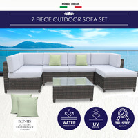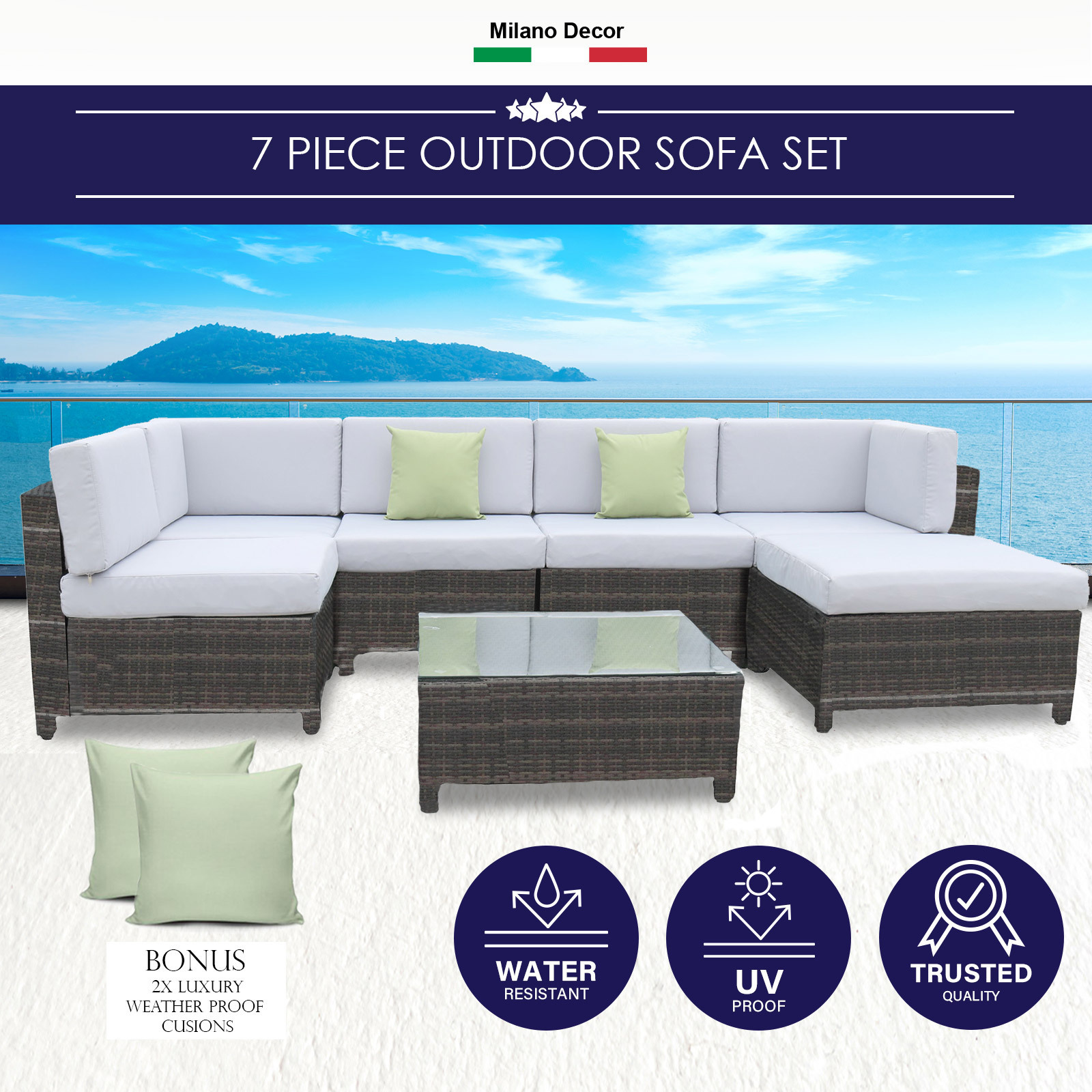 Experience contemporary living and functionality, with the 7-Piece Black and Grey Rattan Sofa Set designed by Milano! This Sofa Set has been designed with the outdoor space in mind and its 7-piece design allows for different configurations. Made from weather and UV-resistant PE Wicker Rattan with a sturdy and hidden Steel frame, it features plush foam seat cushions which are upholstered in waterproof, easy-to-clean polyester fabric. The cushions are also easily removable and easy to clean, to allow for both functionality during different seasons and for convenience. The coffee-table features a tempered glass table-top for peace of mind and the Sofa Set’s overall contemporary and minimalist design makes this conversation Sofa Set a perfect additional to any outdoor setting.