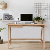 Made from the finest materials, this is a multi-purpose desk that adds usability and style without taking up much space. The desk looks great in a living room, home office, bedroom, or study room. It provides enough space for writing, office work, studying, or reading. The desk, designed in the Industrial Style, gives a sleek look to your room. It features a spacious top with a storage drawer underneath to keep your workspace well-organized.The desk has a fixed LHF drawer with full extension metal runners for smooth and long-lasting function. The drawer also has a black felt lining for an added touch of luxury. The desk in the Ash Natural finish is made of a combination of Ash wood, MDF, and Veneer Ash, all harvested in a sustainable way. The superlative combination of woods gives it great strength, water resistance, and beautiful looks. The easy-to-assemble desk comes with a one-year warranty.