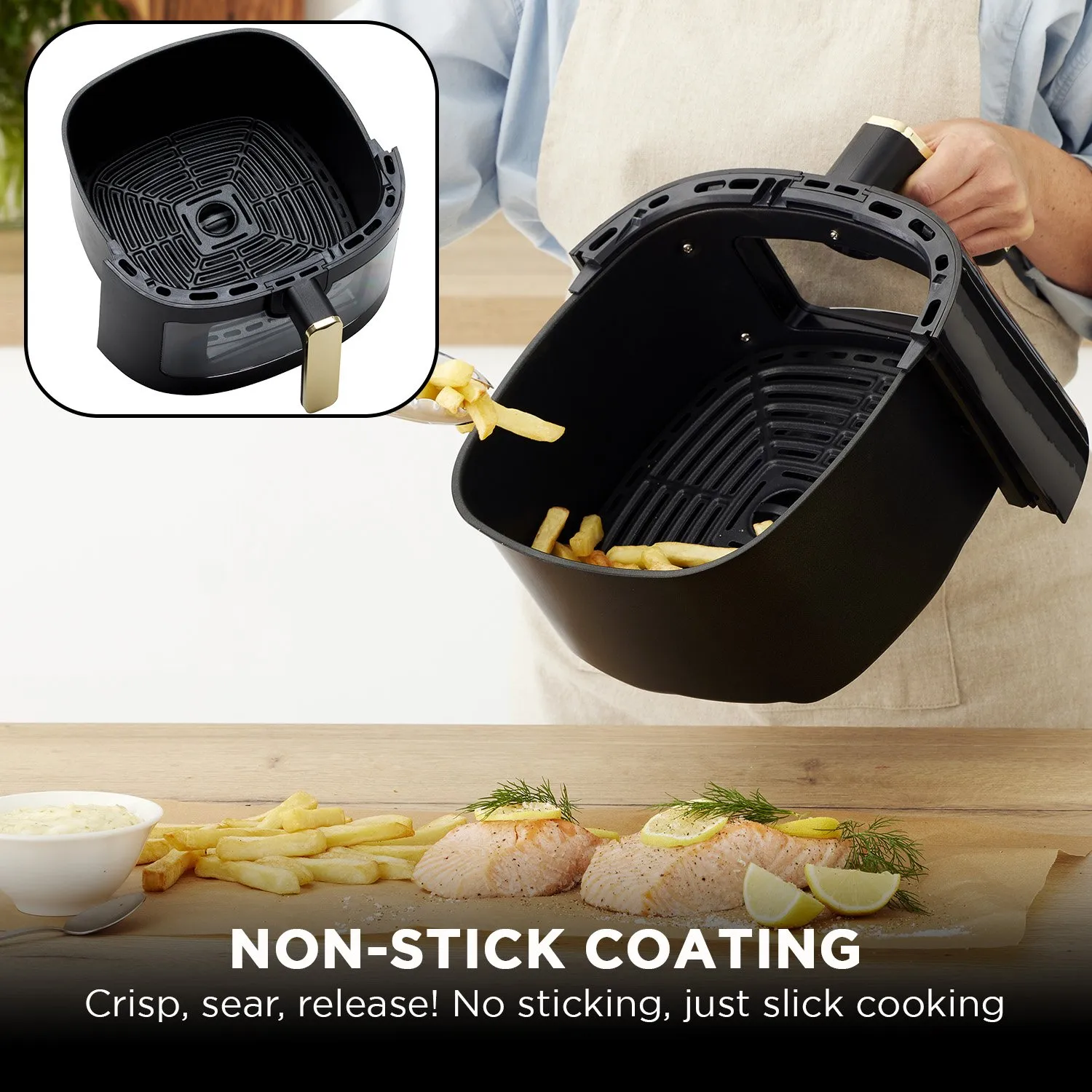 Designed for convenience, the nonstick PTFE coated drawer and frying rack are dishwasher safe, while the soft gold-painted handle adds a stylish finish. With adjustable temperatures from 40°C to 200°C, you can achieve delicious results every time.