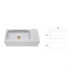 650mm x 300x200mm curved basin bowl No tap/faucet mount No overflow Domestic, commercial, and hotel use Can be wall hung or bench top mounted Chrome pop-up plug drain included