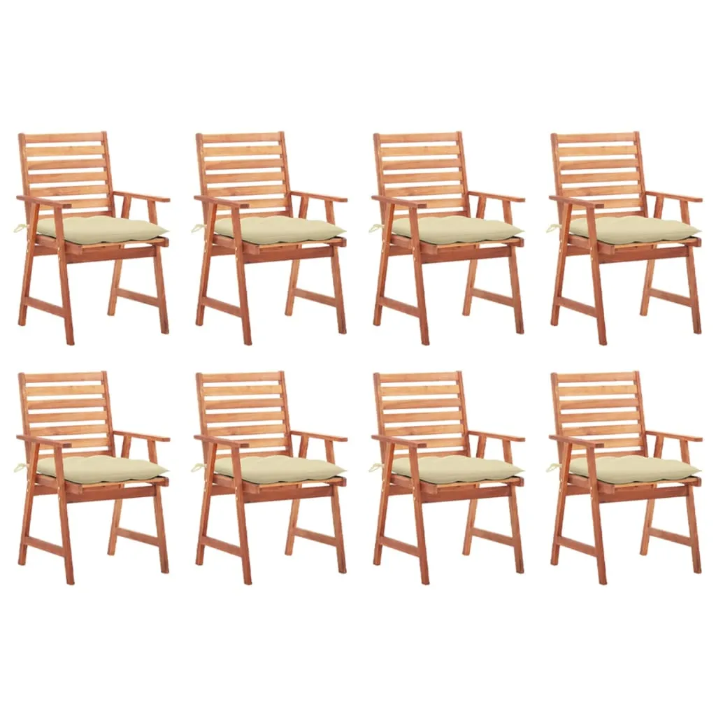 This contemporary wooden dining chair set with cushions will add a touch of natural style to your garden, terrace or patio. This wooden chair set will be a great choice for al fresco dining. These garden chairs are made of solid acacia wood, a tropical hardwood, which is weather-resistant and durable for years of use. The oil finished surface is easy to clean with a damp cloth. The slatted design will bring a rustic charm. What's more, the included cushions provide extra comfort while seating. It is made of 100% polyester that has been treated to make it waterproof. Each cushion has two sets of ropes to fix it on the chair tightly. Note: In order to extend the life of your outdoor furniture, we recommend you to protect it with a waterproof cover.