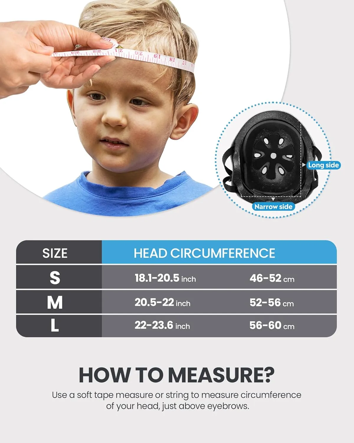 Protect kids with both comfort and impact resistance. REINFORCED ABS SHELL THICKENED SHOCK-ABSORBING EPS CORE provides solid protection when skateboarding, rollerblading, cycling and etc.