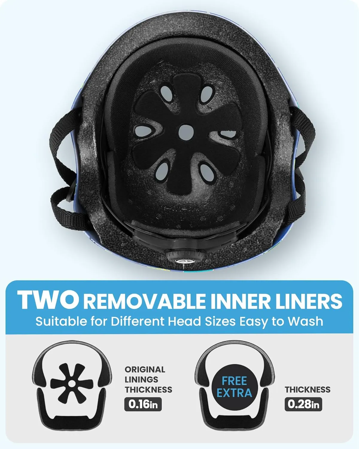 Kids skateboard helmet with two removable liners for different head sizes and easy to wash the sweat away.