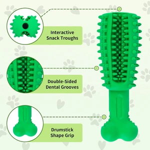 This dog chew toy doubles as a teething aid and food - dispenser.Its textured design with raised nubs cleans teeth, reduces plaque, and soothes gums.The hollow center holds snacks, turning play into a rewarding challenge.Durable rubber withstands aggressive chewing, keeping dogs mentally and physically engaged—ideal for dental care and anxiety relief.