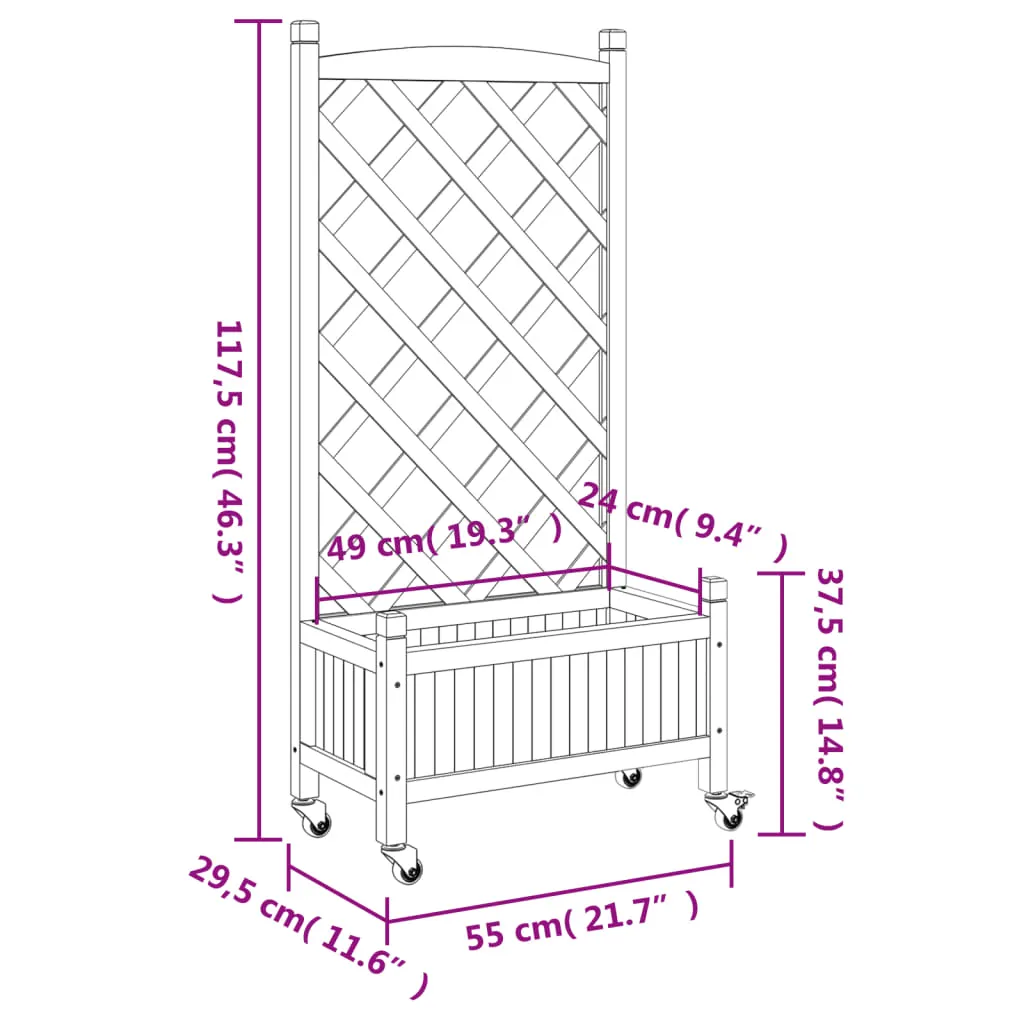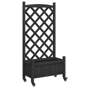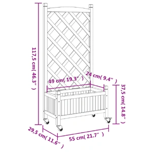 This wooden planter with trellis and wheels is an excellent choice for climbing plants in your garden, patio and terrace. Solid fir wood: Solid fir wood is a beautiful and durable material that maintains its integrity even when exposed to moisture. It does not dry out or warp, making it a reliable choice.Sufficient space: This garden planter is wide and deep enough, providing ample room for growing a variety of plants, flowers, and vegetables. Additionally, the hollow bottom allows for good ventilation and drainage.Trellis fence panel: The patio planter comes with a beautiful trellis fence panel that is perfect for supporting climbing and hanging plants like roses, ivy, or vines. It also adds a stunning visual feature to your outdoor space.Convenient wheels: The solid wheel helps to easily move around your planter when the wheel is attached.Wide applications: This outdoor planter is designed with a round top bar, giving it a stylish and elegant appearance that complements any outdoor space. It can be placed in a patio corner or leaned against a wall or fence. Good to know:The delivery includes the planter only; the liner is not included.