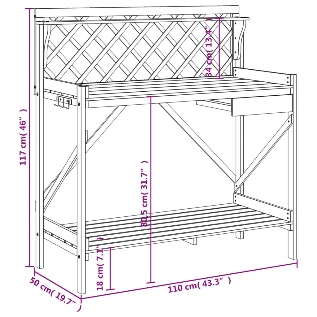 This potting bench is perfect for organising and displaying your potted plants at home, in a garden, on a patio, or on a terrace. Sturdy and durable: This potting bench table is made of solid fir wood, which makes it durable and long-lasting. Versatile storage space: The potting workbench with open shelves, a top rail, metal hooks on the side, and a drawer provides sufficient space for related goods such as small gardening tools, soil, fertilizers, etc.Decorations: The potting bench has a trellis, which provides upward growing space for climbing plants. Meanwhile, the diamond lattice trellis is suitable for hanging basket plants or decorations to embellish your garden.Ventilated: This bottom shelf with a slat design can allow water flow, which is not easy to rot and has a long service life.Multiple applications: The garden potting bench can not only bring a sense of nature to your space but can also be a perfect addition to your courtyard, garden, greenhouse, and more. Good to know:To make sure your outdoor furniture stays beautiful, we recommend protecting it with a waterproof cover. Warning:To prevent it from tipping over, this product must be used with the provided wall attachment device.