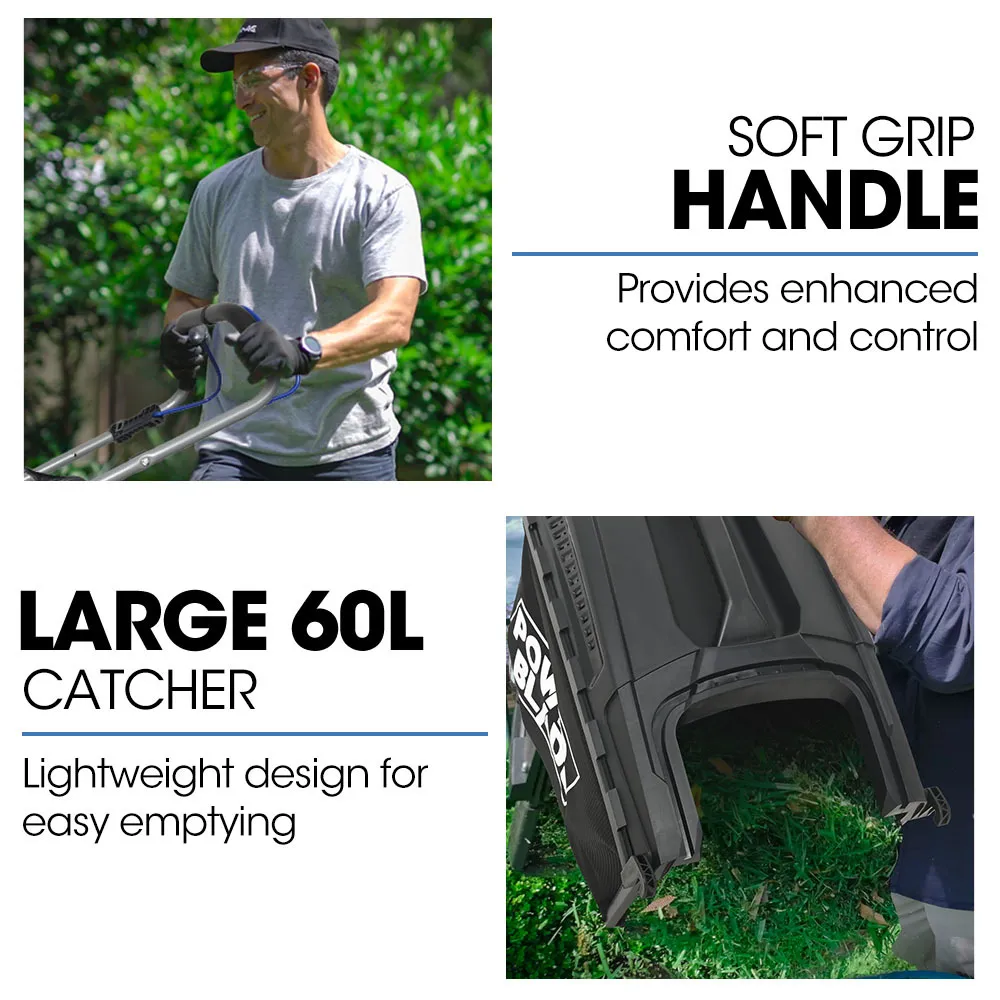 Navigate any terrain smoothly with oversized wheels and premium bearings, while the heavy-duty quad swing blade system ensures a precise 20-inch cut. The swing blades are designed to protect the shaft in the event of a solid object being hit. The generous 60L catcher means fewer stops and more continuous mowing.
