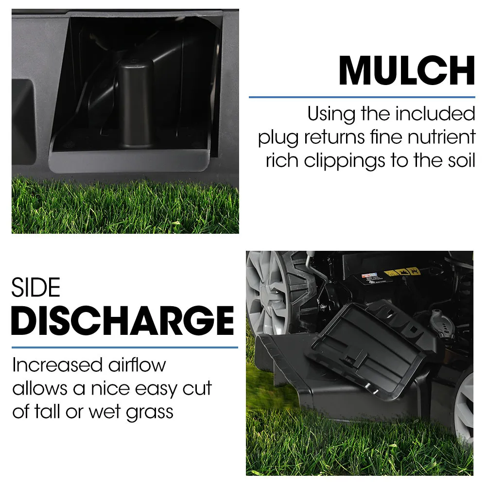 Mulch: Use the included plug to nourish your lawn with natural nutrients