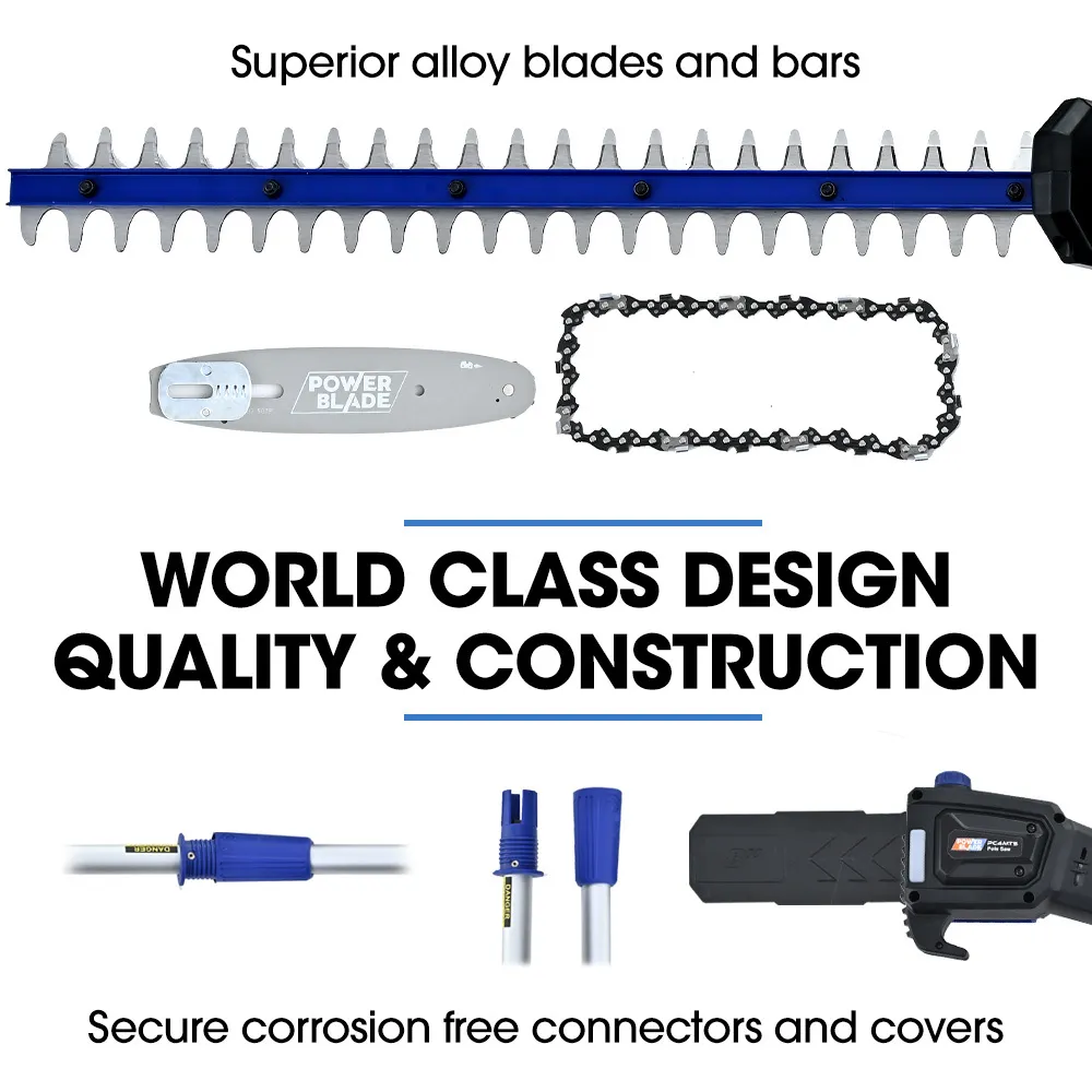 The all-new PowerBlade 20V PC4MT5 Combo Kit features a versatile Pole Saw and a powerful Pole Hedge Trimmer. PowerBlade continues to deliver innovative gardening tools with a new line of 20V lithium-ion battery-powered garden tools. Revolutionise your outdoor maintenance with these cordless tools.