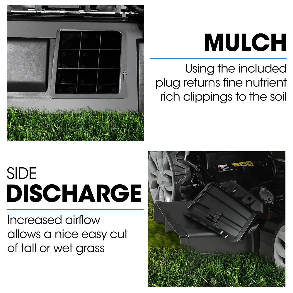 Mulch: Use the included plug to nourish your lawn with natural nutrients