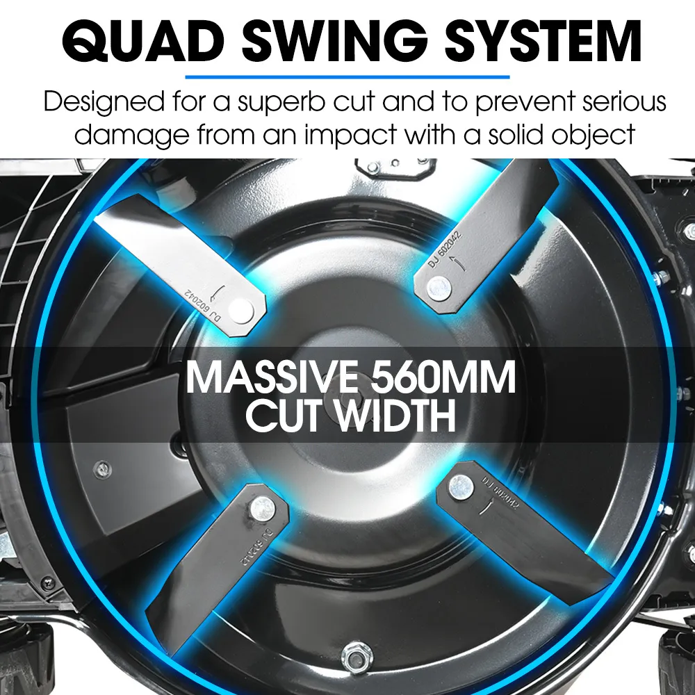 Navigate any terrain smoothly with oversized wheels and premium bearings, while the heavy-duty quad swing blade system ensures a precise cut of a very wide 22-inch path. The swing blades are designed to protect the shaft in the event of a solid object being hit. The generous 60L catcher means fewer stops and more continuous mowing.