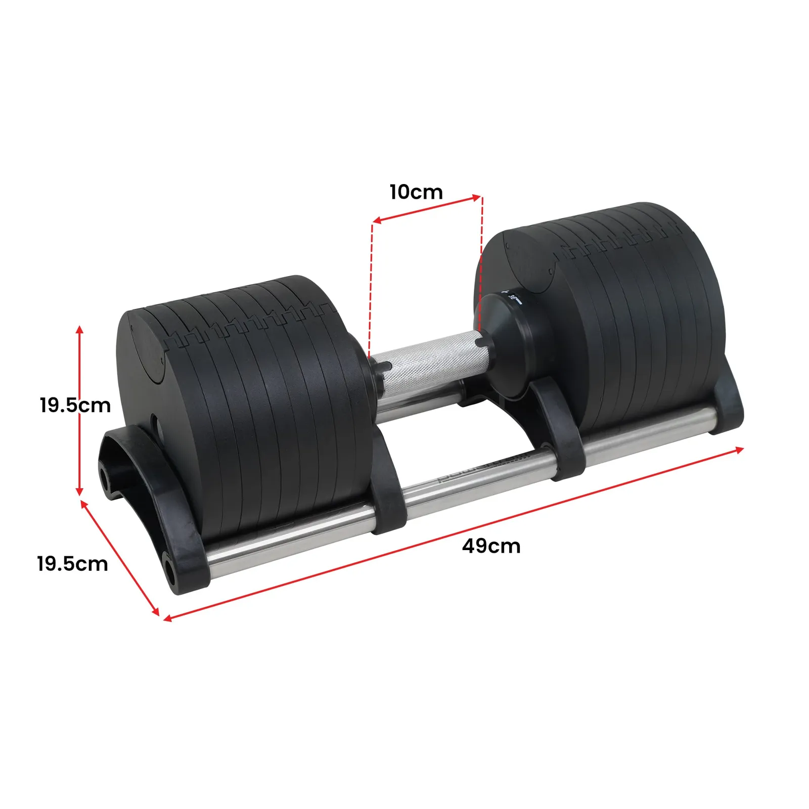 - Dimensions per Dumbell (H x W x L): 19.5cm x 19.5cm x 49cm