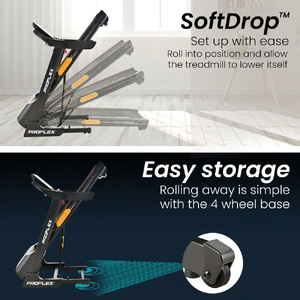 Experience a smoother and more comfortable run with the TRX9s' SmoothStride 8-point suspension system. Roll the treadmill out with ease on dual wheels and activate the hydraulic SoftDrop feature, which lowers your deck down into position at a safe, smooth pace.
