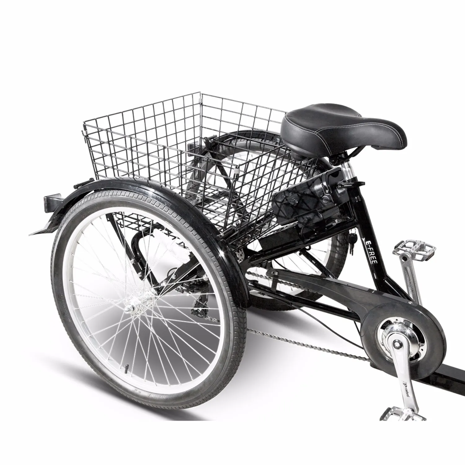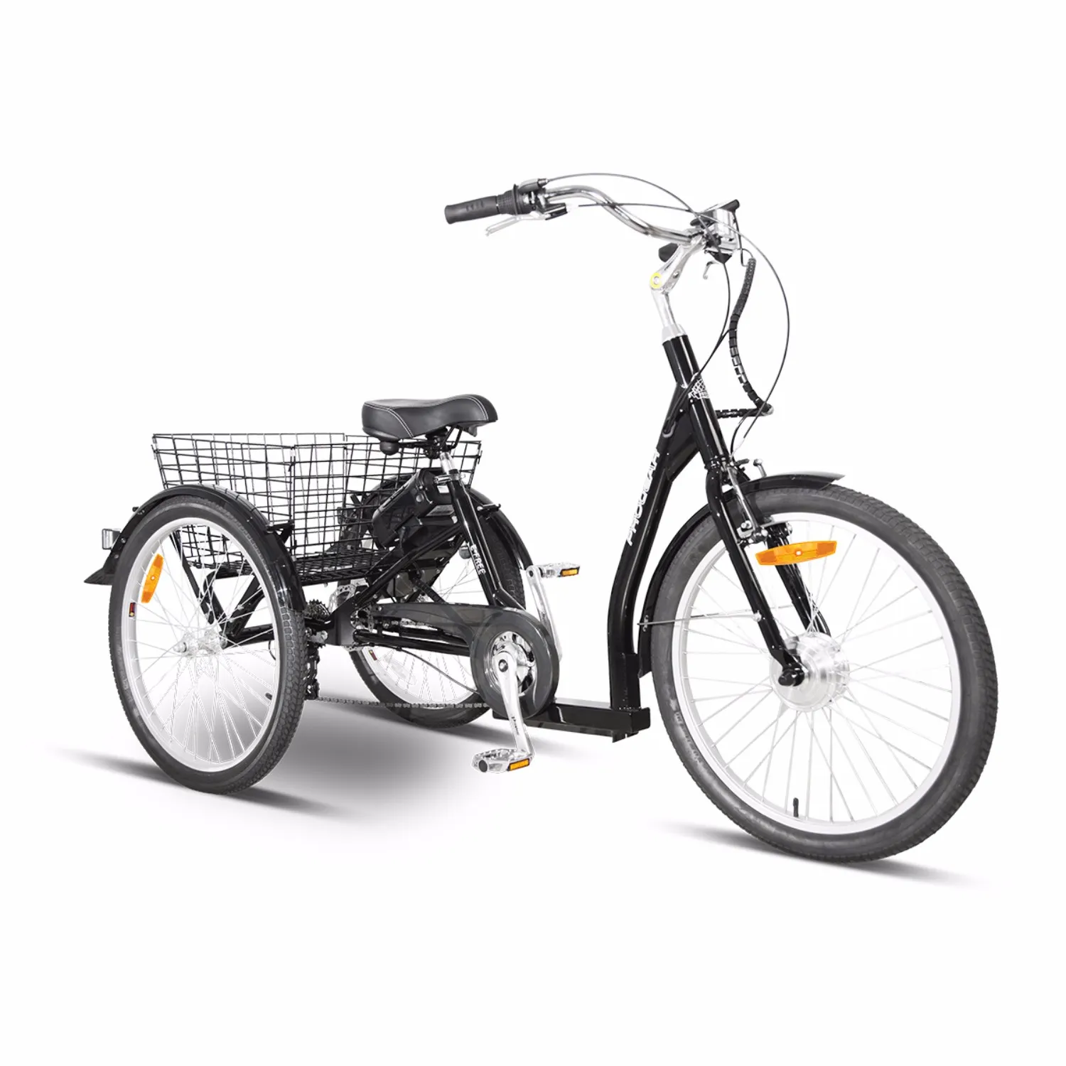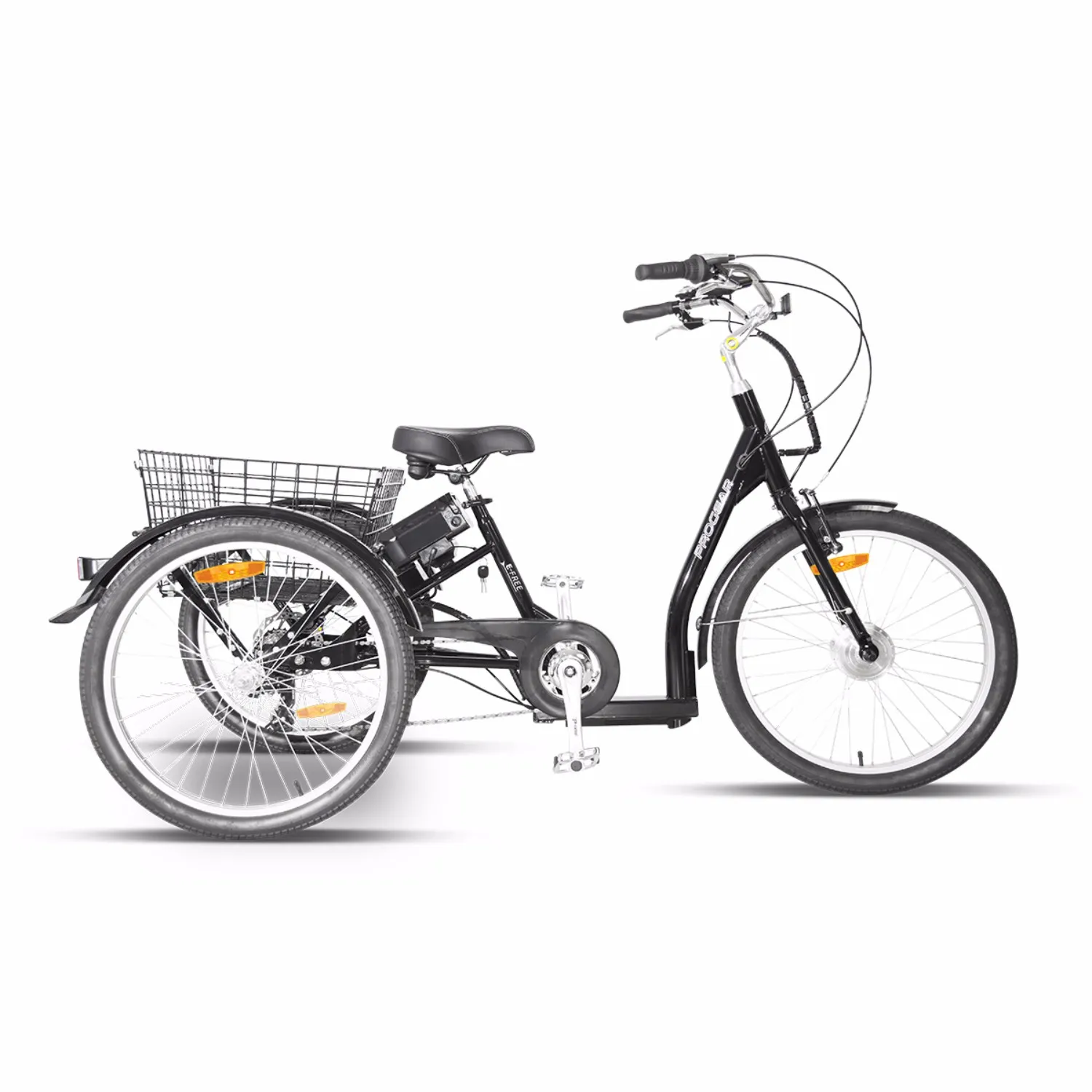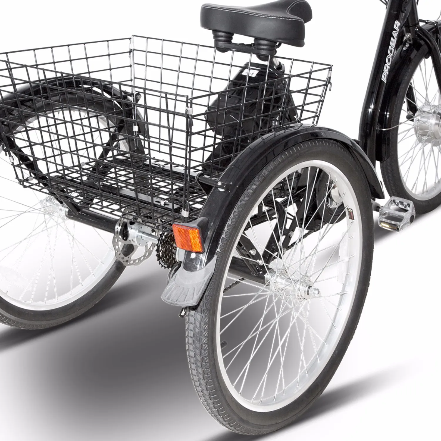 The Progear Bikes E-Free 24" electric tricycle is accessible for riders of any level.Two rear wheels guarantee stability, and a low step-through frame make mounting and dismounting safe an easy for all riders. Riders with disabilities, injuries, and the elderly will especially enjoy the accessibility of the E-Free.This electric trike is even easier to ride with a pedal assist electric motor. The 250W hub drive motor supports riding speeds up to 25km/h for distances up to 25km with the 36V lithium ion battery. Take charge of 5 levels of pedal assist with the LCD display.Cycle through the 7 speed Shimano Tourney drivetrain with RevoShift twist shifters. Trust in the stopping power of front V-Brakes and rear disc brakes.Carrying around cargo is easy with a 59cm x 49cm (Length x Width) rear steel basket.FeaturesFrame: Low-Step Through Steel FrameFork: SteelHandlebars: Chrome Plated SteelRear Derailleur: Shimano Tourney RD-TX35Chainwheel & Crankset:Promax 1/2"x3/32"x38T Chainwheel with 170 Alloy CranksBrake Lever: Promax Alloy Brake LeversFront Brake: Promax Alloy V-BrakesRear Brakes: Rear Disc BrakeShift Lever: Shimano SL-RS45-7R RevoShiftFreewheel: Shimano CS-HG200Stem: Alloy AdjustableSaddle: Padded and Sprung Leather SaddleSaddle Clamp: Promax Alloy Seat Post ClampWheels: Easy Rolling 24"x1.75" TyresGrip: RubberTyres: Kenda 24"x2.125" Black TyreRims: 24"x1.75" Alloy RimsElectrical Components:Motor: 250W DC Brushless 36VDisplay: BLCD Display PanelBattery: 36V 9AH Li-ion Battery with Charge time of 4-6 Hours. EN61000-6-3: 2007+A1: 2011, EN61000-6-1:2007, and UN38.3 Compliant.Distance: Distance on Charge, 25Kms. (Can be affected by other variables)Charger Information: Maximum Speed 25 Km/hCapacity: Load capacity of 110Kgs