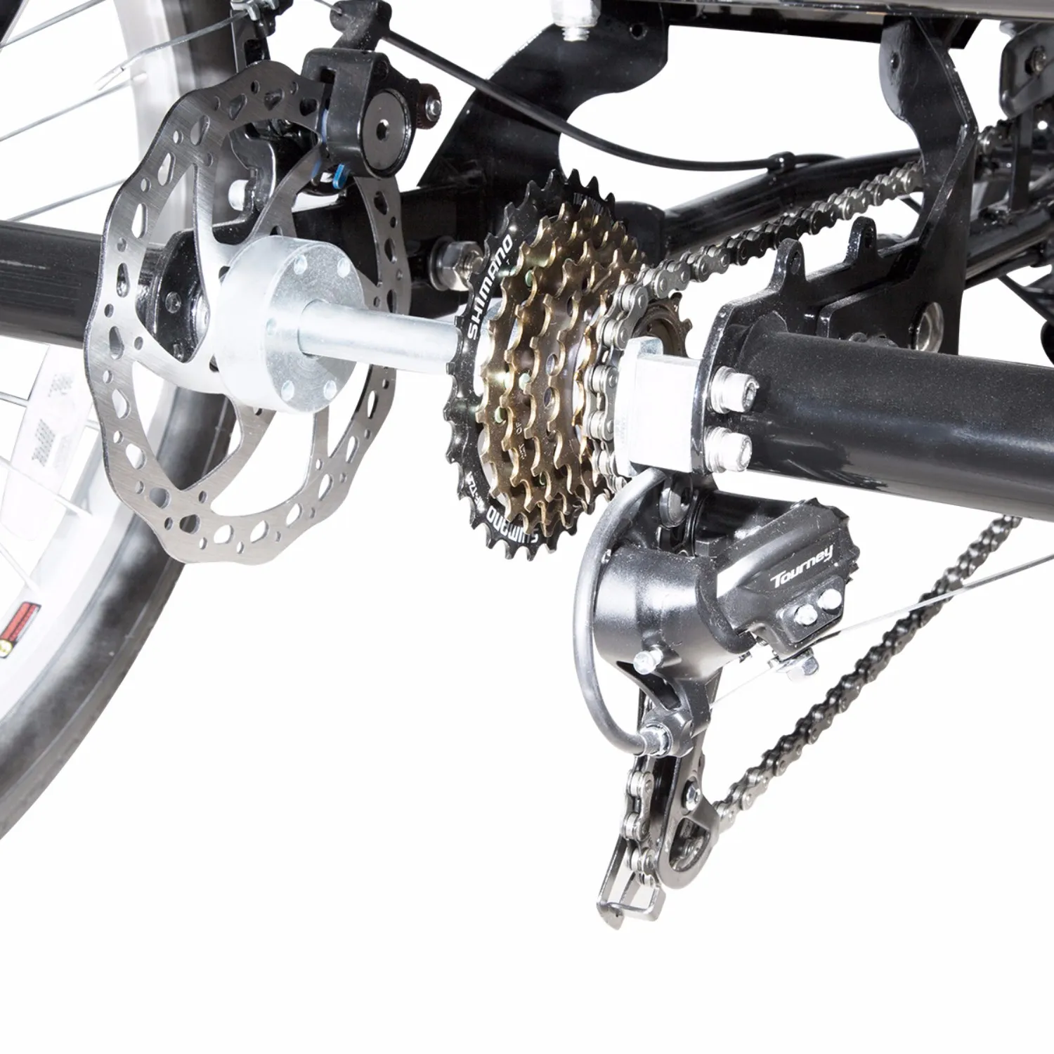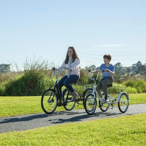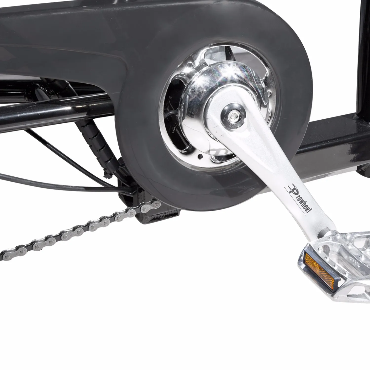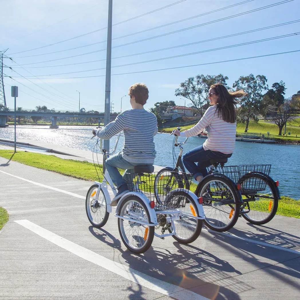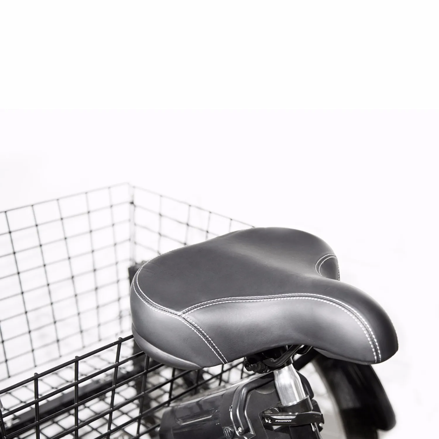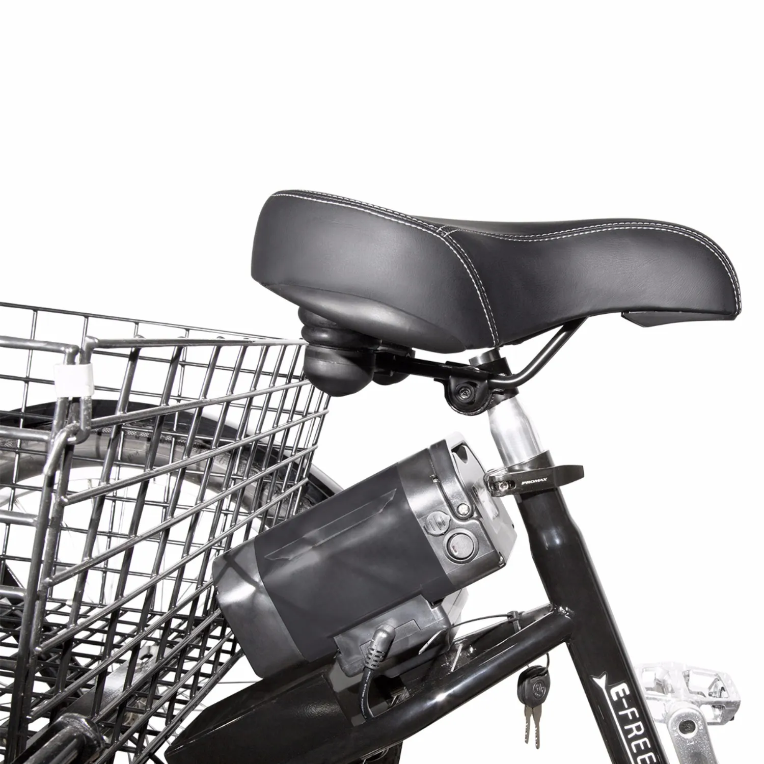 The Progear Bikes E-Free 24" electric tricycle is accessible for riders of any level.Two rear wheels guarantee stability, and a low step-through frame make mounting and dismounting safe an easy for all riders. Riders with disabilities, injuries, and the elderly will especially enjoy the accessibility of the E-Free.This electric trike is even easier to ride with a pedal assist electric motor. The 250W hub drive motor supports riding speeds up to 25km/h for distances up to 25km with the 36V lithium ion battery. Take charge of 5 levels of pedal assist with the LCD display.Cycle through the 7 speed Shimano Tourney drivetrain with RevoShift twist shifters. Trust in the stopping power of front V-Brakes and rear disc brakes.Carrying around cargo is easy with a 59cm x 49cm (Length x Width) rear steel basket.FeaturesFrame: Low-Step Through Steel FrameFork: SteelHandlebars: Chrome Plated SteelRear Derailleur: Shimano Tourney RD-TX35Chainwheel & Crankset:Promax 1/2"x3/32"x38T Chainwheel with 170 Alloy CranksBrake Lever: Promax Alloy Brake LeversFront Brake: Promax Alloy V-BrakesRear Brakes: Rear Disc BrakeShift Lever: Shimano SL-RS45-7R RevoShiftFreewheel: Shimano CS-HG200Stem: Alloy AdjustableSaddle: Padded and Sprung Leather SaddleSaddle Clamp: Promax Alloy Seat Post ClampWheels: Easy Rolling 24"x1.75" TyresGrip: RubberTyres: Kenda 24"x2.125" Black TyreRims: 24"x1.75" Alloy RimsElectrical Components:Motor: 250W DC Brushless 36VDisplay: BLCD Display PanelBattery: 36V 9AH Li-ion Battery with Charge time of 4-6 Hours. EN61000-6-3: 2007+A1: 2011, EN61000-6-1:2007, and UN38.3 Compliant.Distance: Distance on Charge, 25Kms. (Can be affected by other variables)Charger Information: Maximum Speed 25 Km/hCapacity: Load capacity of 110Kgs