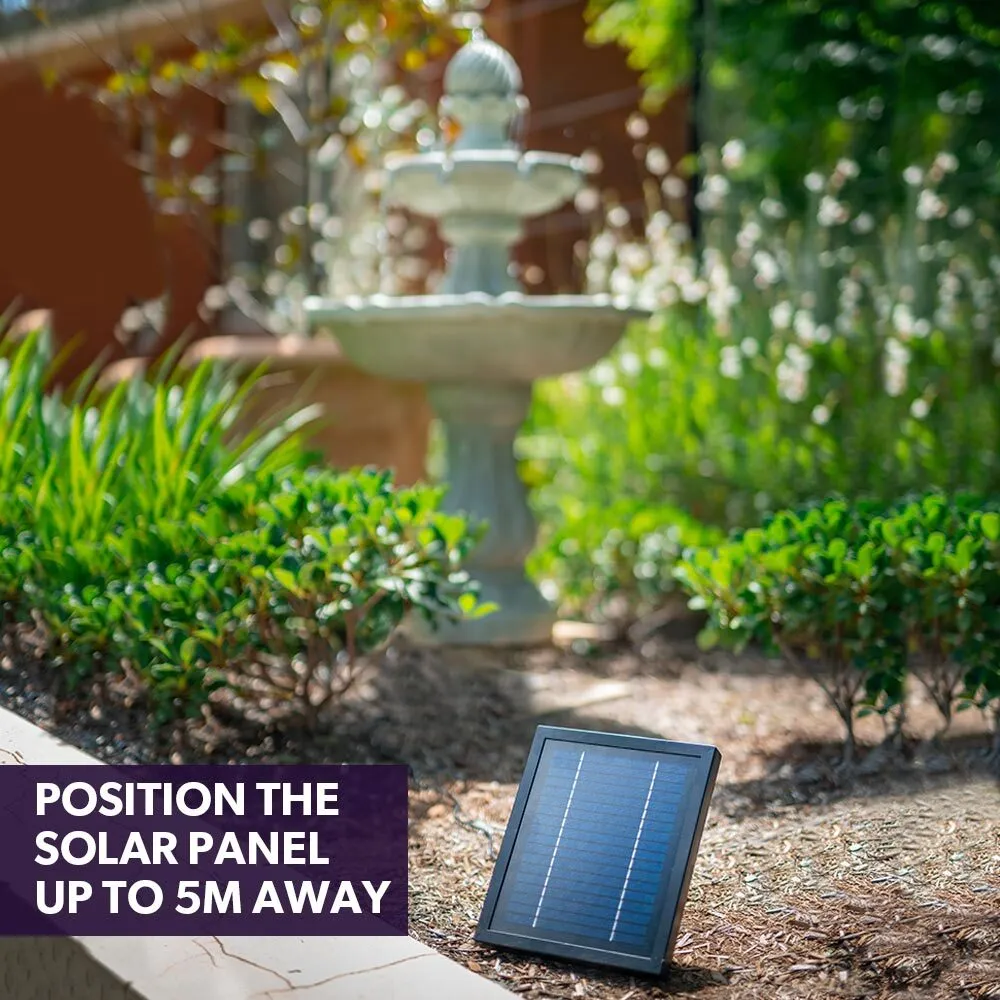 A premium polycrystalline solar panel that can be positioned up to 5 metres away provides clean energy to automatically power the water fountain. Excess energy charges the built-in lithium battery that can provide up to 8 hours of additional performance in cloudy conditions or at night.