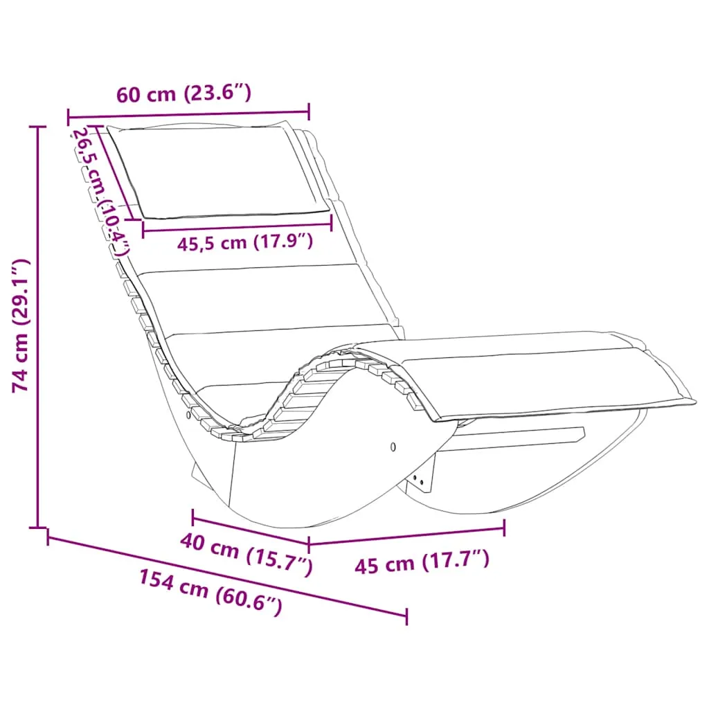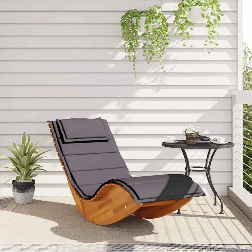 This wooden rocking sun lounger is ideal for sunbathing and relaxing near the swimming pool, on the patio, or in the garden. Robust and stable: Solid acacia wood is known for its strength and durability. Its diverse colours and unique grain patterns give it an attractive appearance. With excellent stability and resistance to weathering, it is ideal for crafting indoor and outdoor furniture.Safe & soothing rocking: You can rock back and forth gently on this garden lounger to relax during your leisure time. The bottom stoppers prevent the wooden rocking chair from tipping over, creating a safe rocking experience for you.Ergonomic design: The sunlounger features an ergonomically designed lying surface that conforms to the contours of your body, allowing you to relax in ultimate comfort.Well-ventilated and pooling prevention: The slatted design promotes optimal airflow and effectively prevents water pooling, ensuring a dry and comfortable seat.Comfortable seat experience: This outdoor furniture, complete with thickly padded cushions, offers a comfortable seating experience. Good to know:To make sure your outdoor furniture stays beautiful, we recommend protecting it with a waterproof cover.