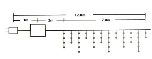 - Total Length: 12.8m: Lighted length 7.8m; light to controller 2m; controller to Power adaptor 3m