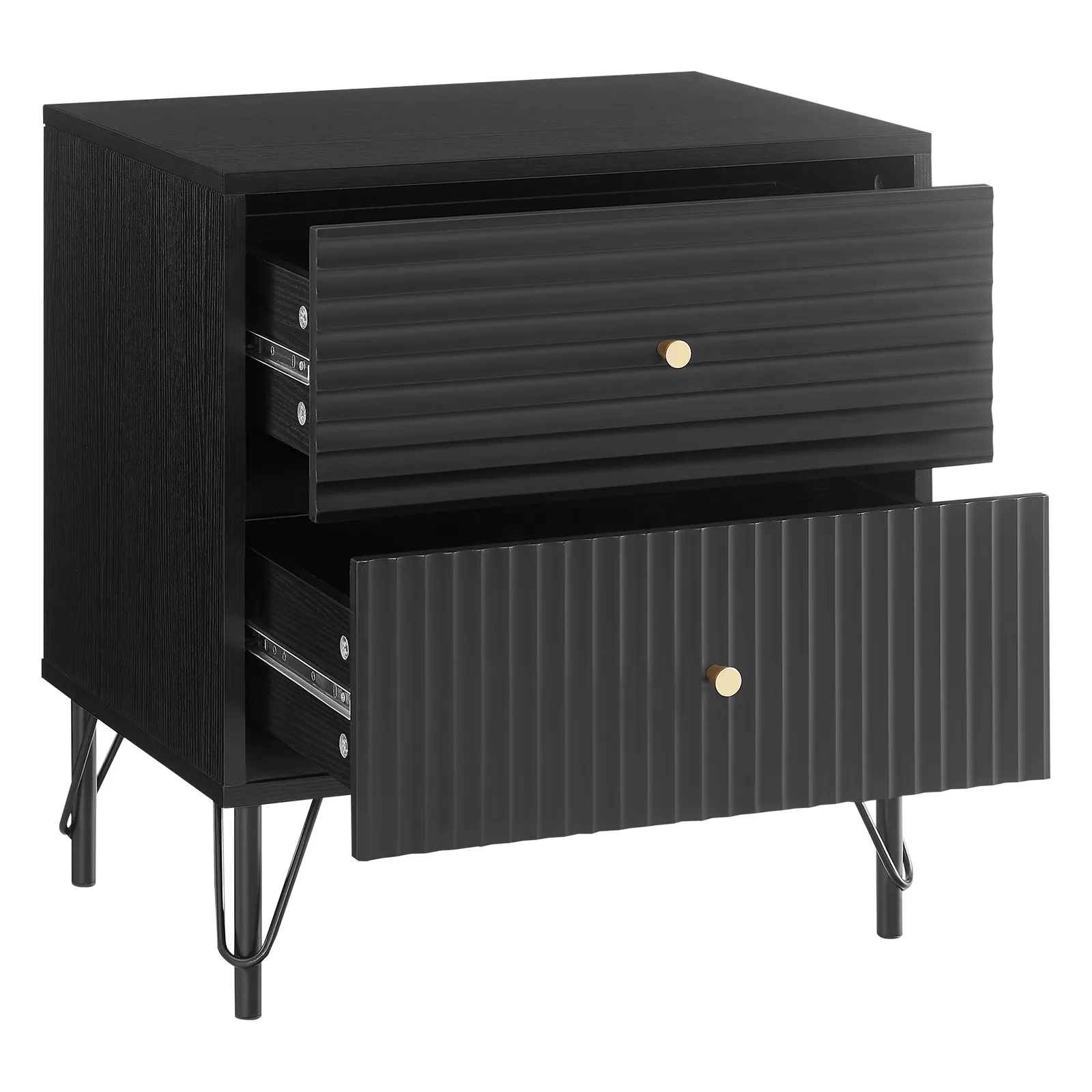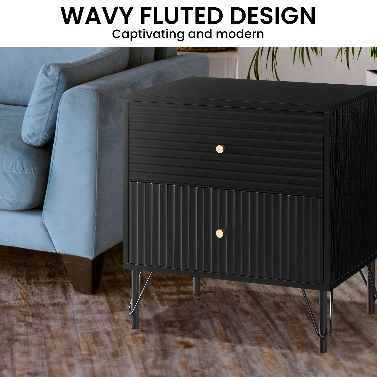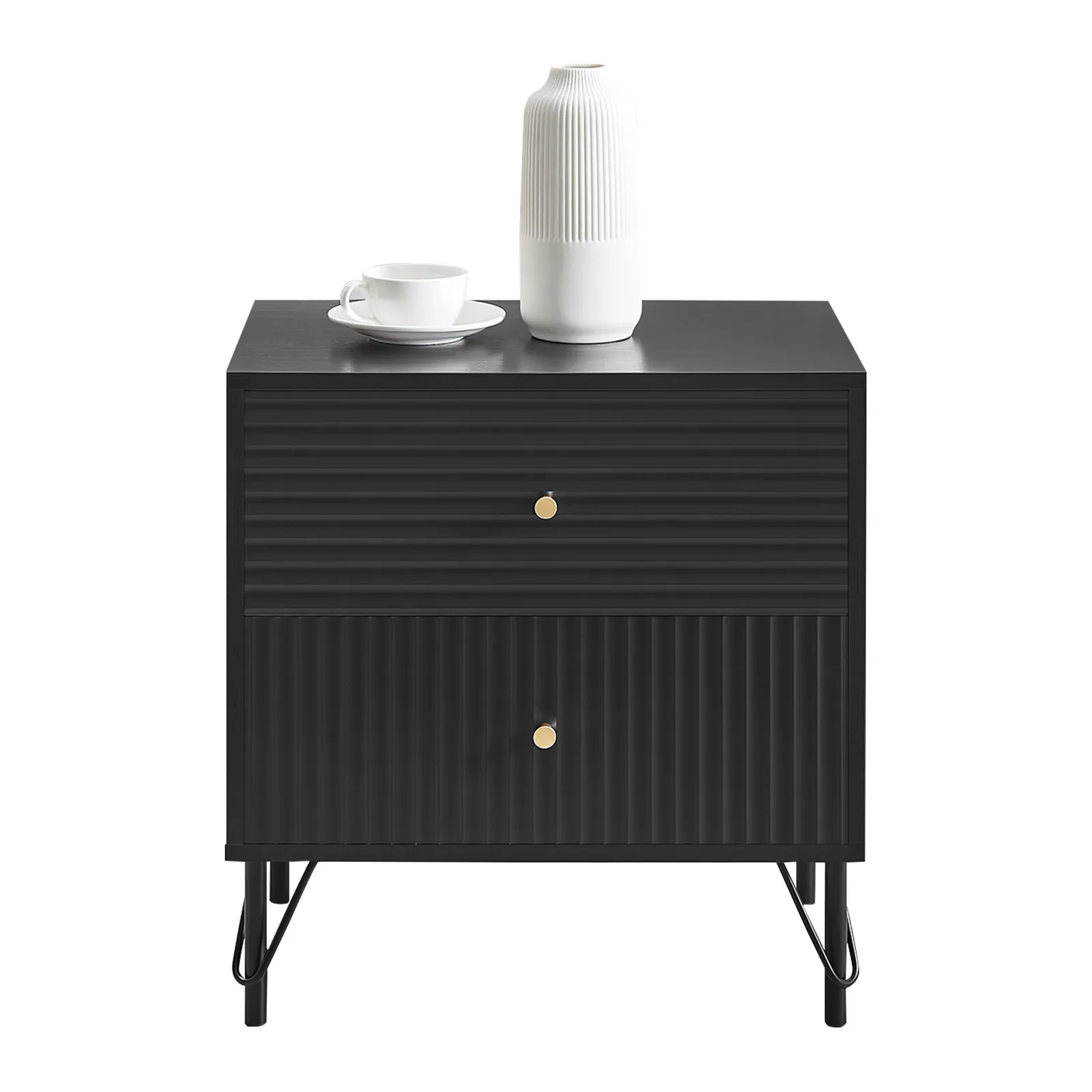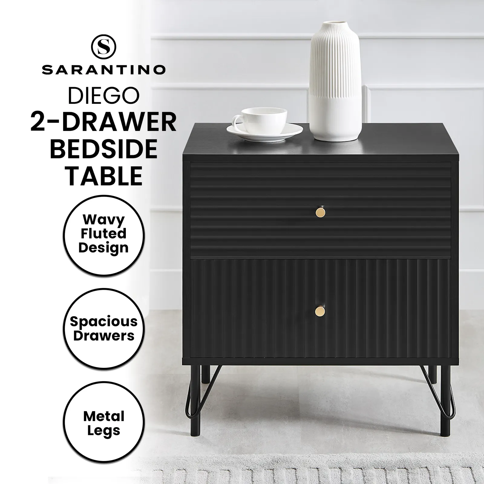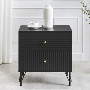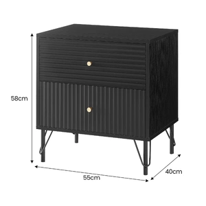 The gold drawer handles provide an elegant contrast, while the black powder-coated metal base exudes contemporary charm. Practicality meets style with spacious drawers for seamless organisation. Supported by sturdy metal legs, this piece provides a strong foundation. Elevate your sleeping space with the Diego Bedside Table.