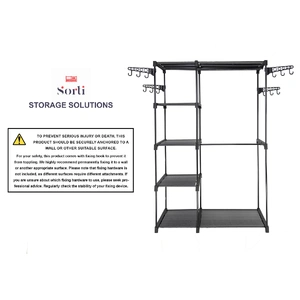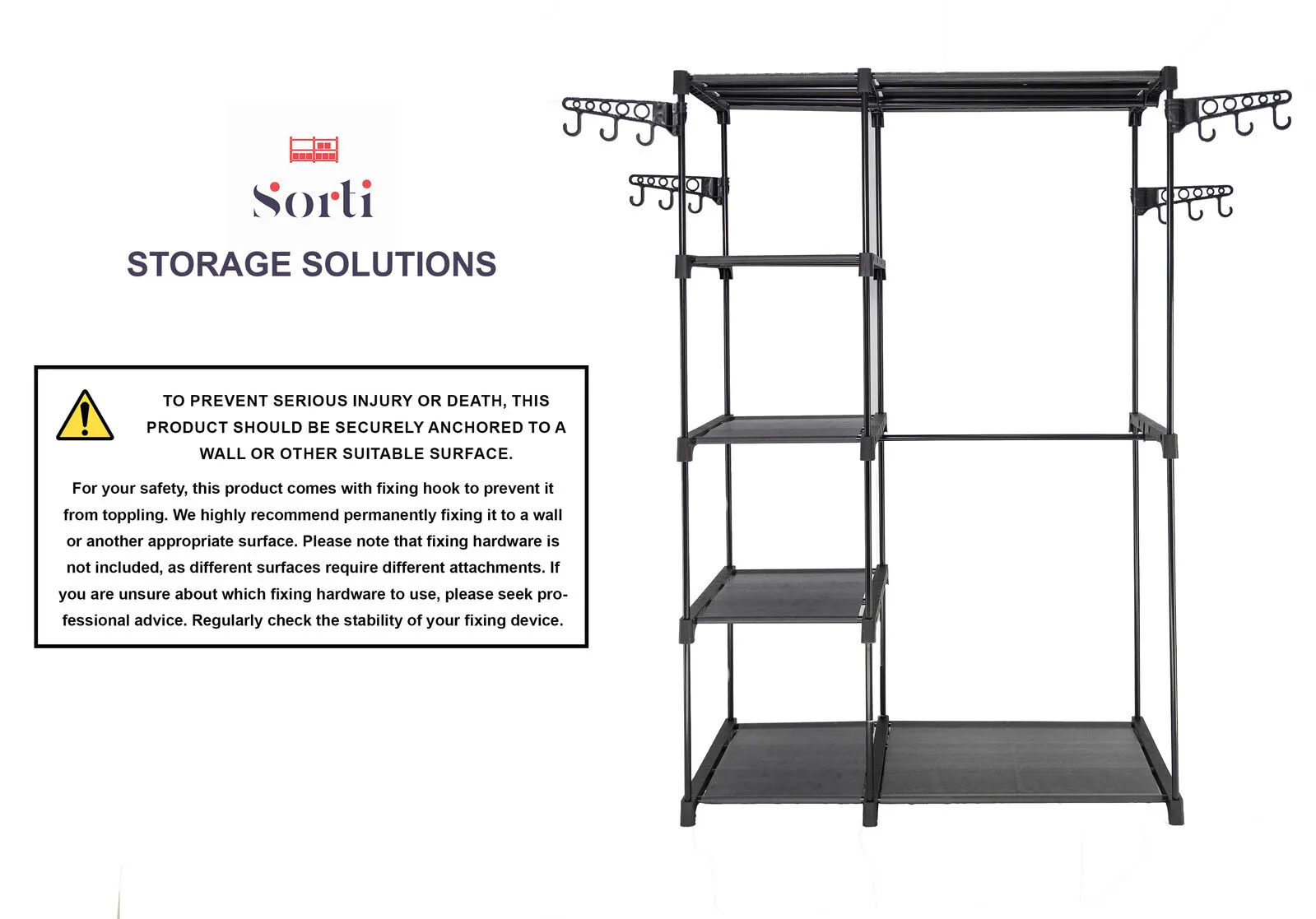 Optimize your home organization with the Sorti Garment Clothes Rack, a space-saving solution designed to simplify wardrobe management. This freestanding metal wardrobe combines style and functionality to meet all your storage needs.