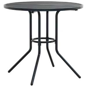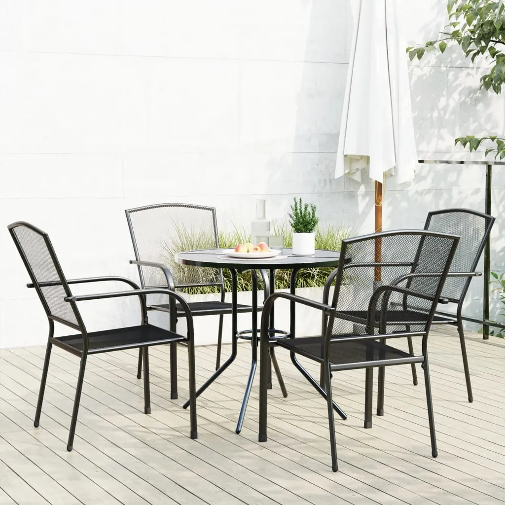 This garden chair set featuring a stylish look is a striking addition to your current outdoor and indoor living space. Powder-coated steel: This garden bar set is made of powder-coated steel, which is an exceptionally hard and strong material. It offers sturdiness and stability. The powder coating on the surface of steel creates a protective layer against rust, corrosion, and wear.Practical design: These bistro chairs have backrests, which can provide you added comfort, so you can sit comfortably on the chairs.Stackable function: The stackable design of the chairs save room space.Mesh tabletop: The mesh tabletop features beautiful patterns and is suitable for placing drinks, food and other essentials.Wide applications: This multifunctional outdoor chair set features a perfect shape to fit in any environment in your house. It can be used in your kitchen, dining room, living room, patio etc.