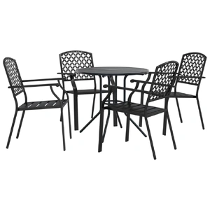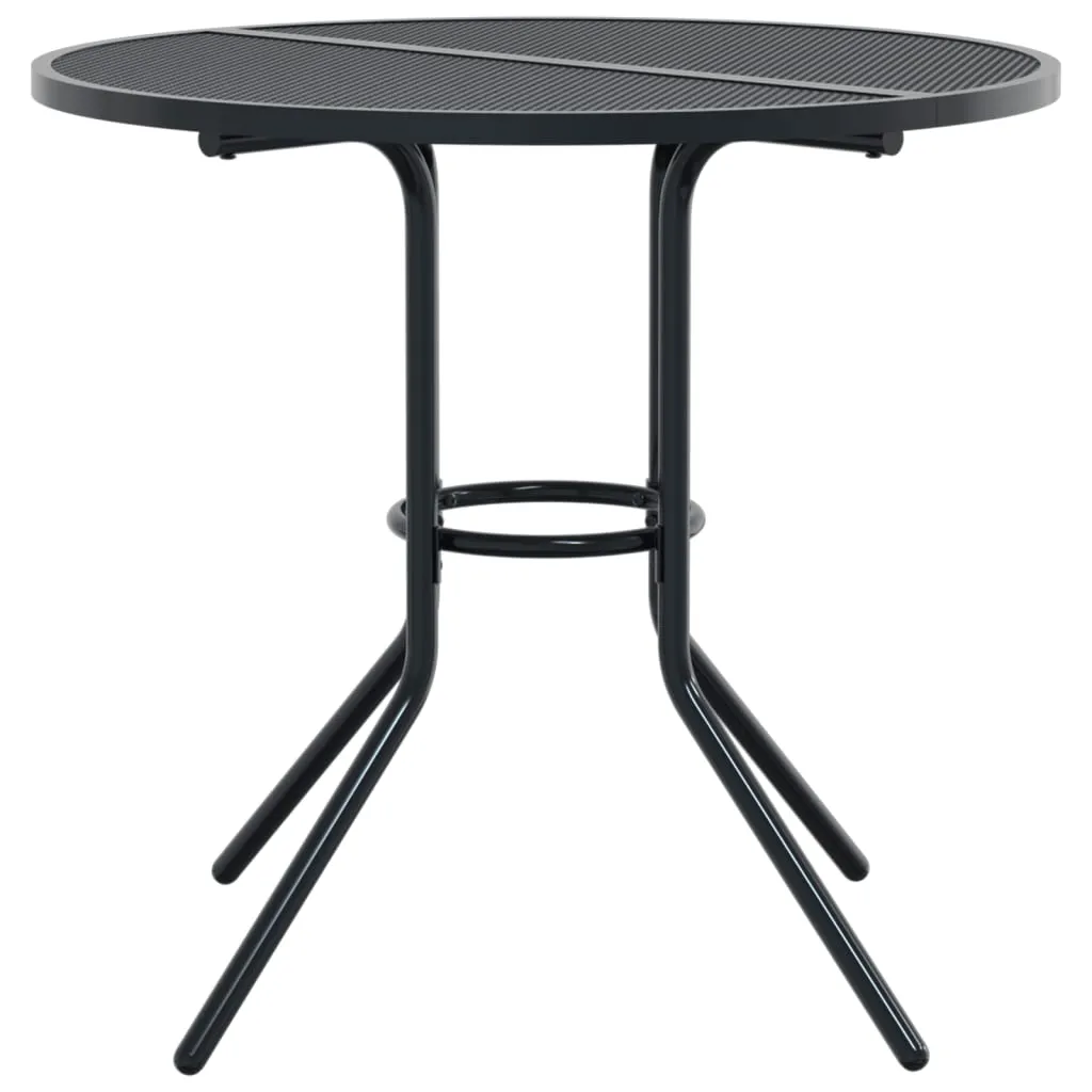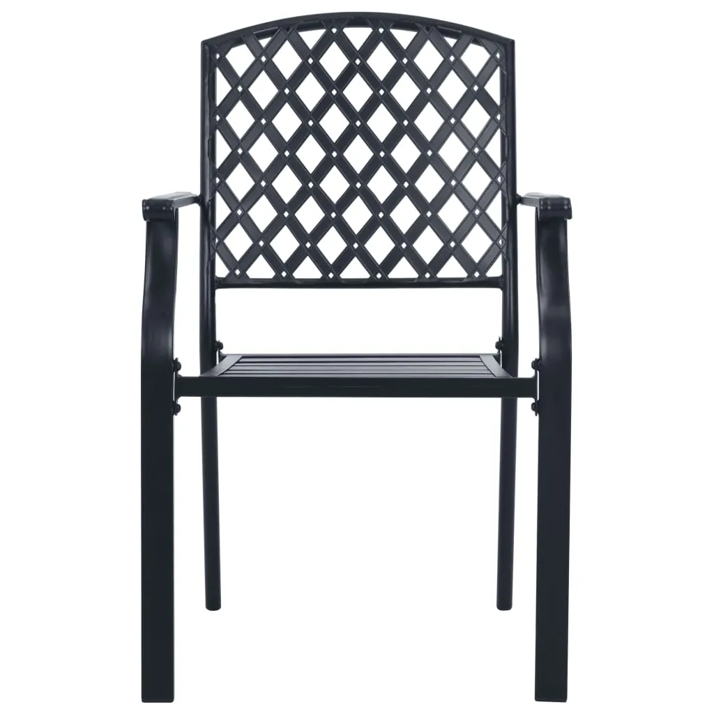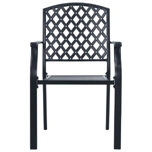 This garden chair set featuring a stylish look is a striking addition to your current outdoor and indoor living space. Powder-coated steel: This garden bar set is made of powder-coated steel, which is an exceptionally hard and strong material. It offers sturdiness and stability. The powder coating on the surface of steel creates a protective layer against rust, corrosion, and wear.Practical design: These bistro chairs have backrests, which can provide you added comfort, so you can sit comfortably on the chairs.Stackable function: The stackable design of the chairs save room space.Mesh tabletop: The mesh tabletop features beautiful patterns and is suitable for placing drinks, food and other essentials.Wide applications: This multifunctional outdoor chair set features a perfect shape to fit in any environment in your house. It can be used in your kitchen, dining room, living room, patio etc.