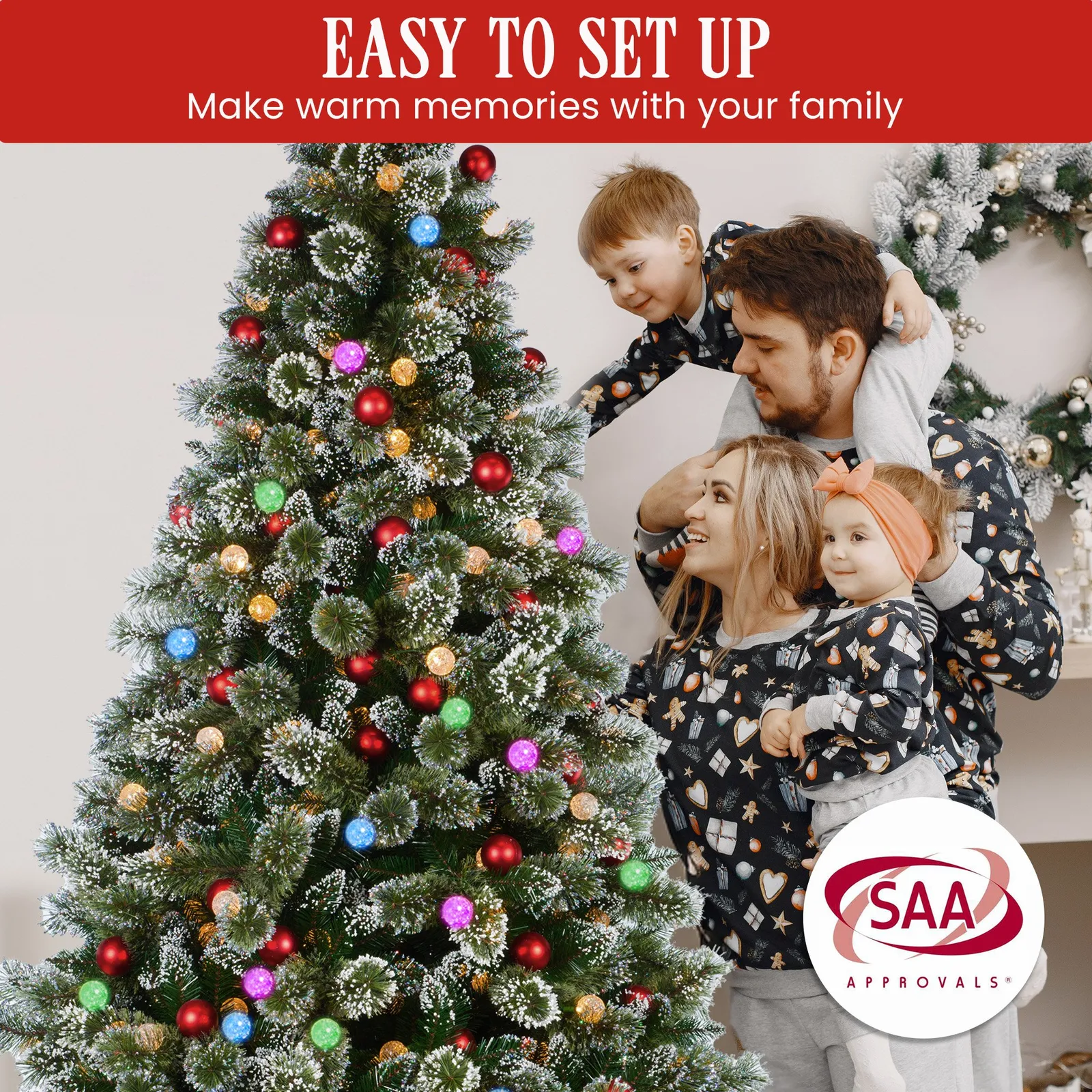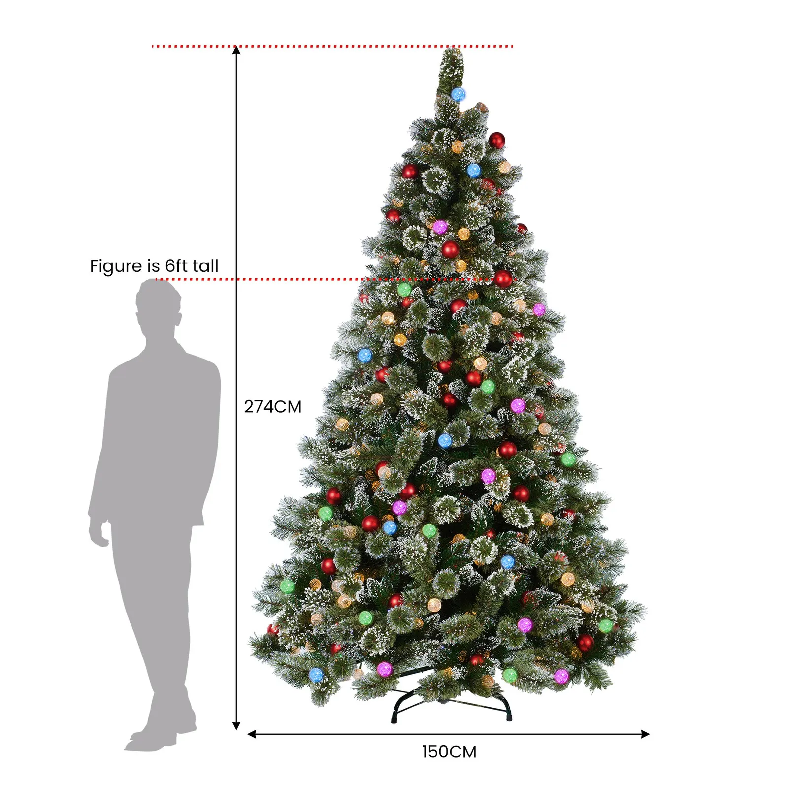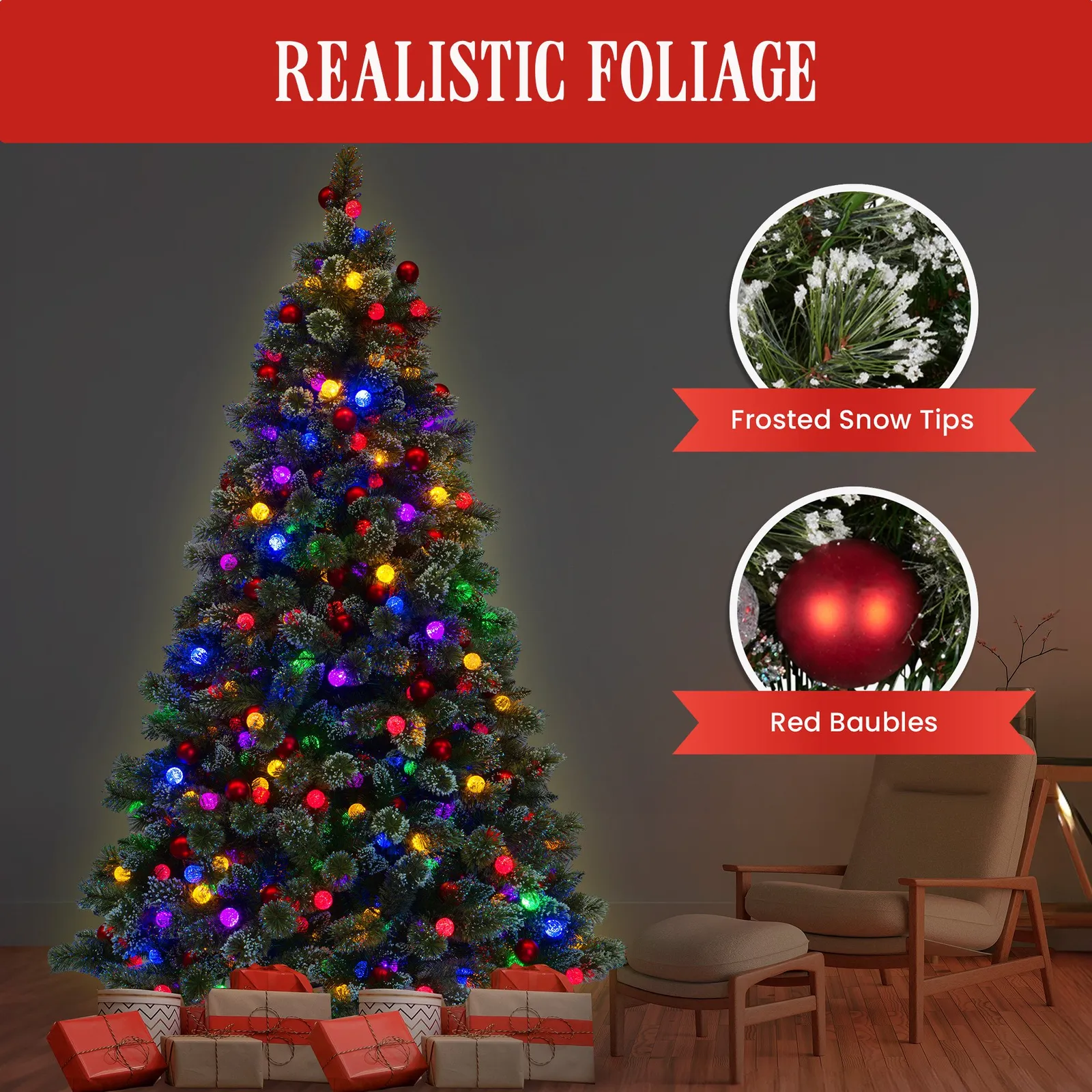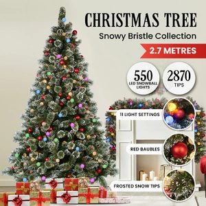- Pre-decorated with red baubles