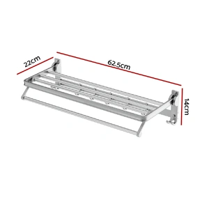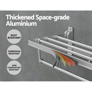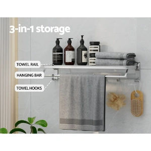 Give your bathroom a glossy makeover with the new sleek and functional Towel Rack. Crafted with space-grade aluminium, the rack is rust and corrosion-resistant to ensure long-lasting use, while the matte grey finish adds a touch of elegance to any space. Designed with convenience in mind, this towel rack is foldable and can swivel up to 90 degrees to easily adjust to your desired position. With a sliding bar and 5 movable, reinforced hooks, the rack provides ample storage for towels and other essentials. Its safe and round corners prevent accidental scrapes. With its easy installation process, this 3-in-1 storage solution is perfect for your bathroom, kitchen or laundry room. Upgrade your space and enjoy a clutter-free bathroom with our Towel Rack.
