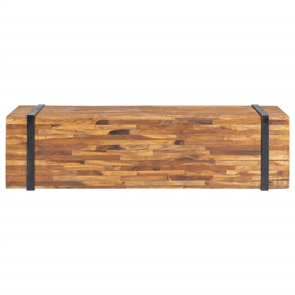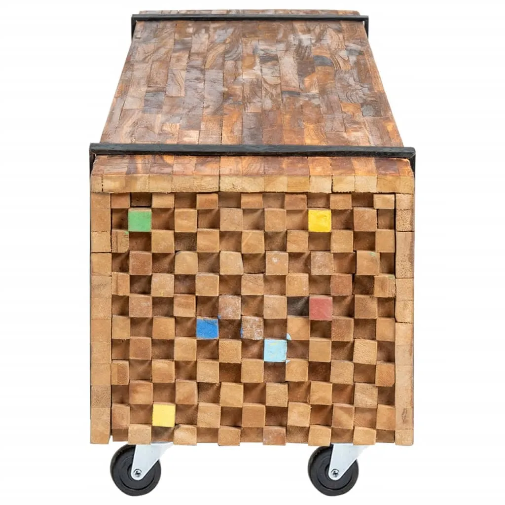 This classic wooden TV stand features a unique industrial style, making it a great addition to your living room or entertainment area. It is also perfect as a coffee table, sideboard or low board. This sturdy and robust TV unit is crafted from teak hardwood to look like a stack of beams held together by a pair of black belts. Its sturdy top has ample space for your TV or vases, potted plants, fruit baskets, and other decorative items. The natural finish makes the TV rack easy to clean. Thanks to its four wheels, it is also easy to move around. Good to know:Colours and grains vary per furniture item, making each piece unique. The delivery is random.