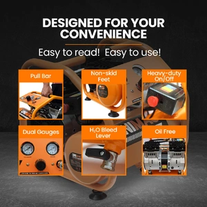 - Easy-to-use design includes moisture bleed valve, large gauges, safety off button, air bleed safety, and more.