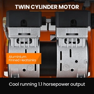This air compressor has a 1.1hp twin-cylinder motor. The 2850 RPM motor is more than twice as fast as our competitors. It has fan-forced cooling and aluminium heatsinks that keep this high-performance motor running cool.