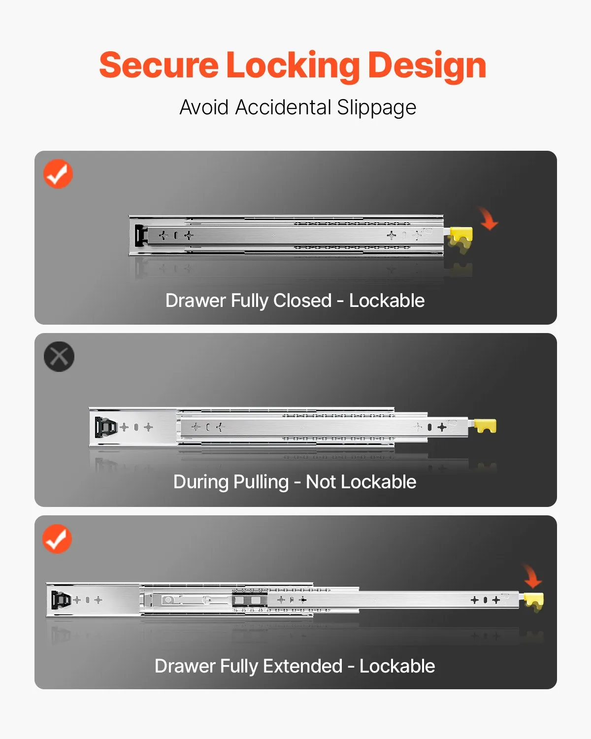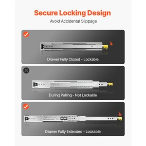 The full extension dresser drawer slides are equipped with a locking design that locks the slides with a simple press, ensuring that your items are secure and won't slip off even in bumpy roads.