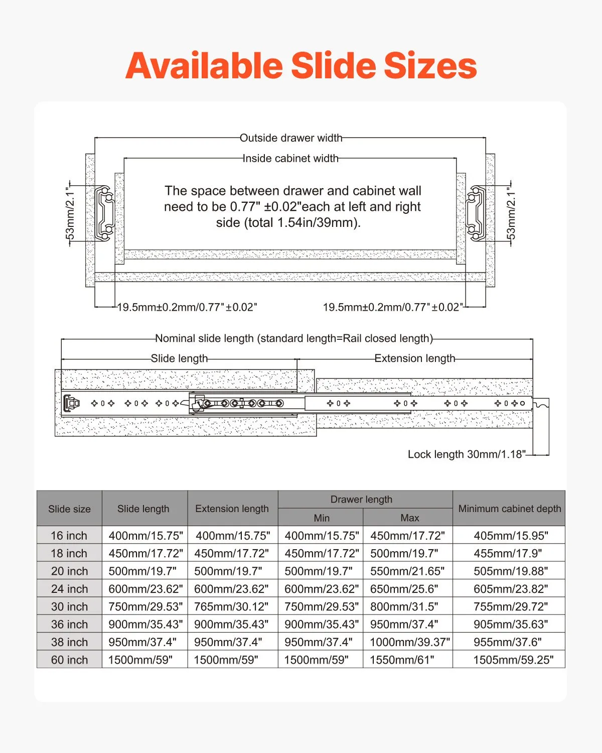 Full extension drawer slides are compatible with most major drawer and cabinets. Please see the pictures for a detailed description of each size when choosing. Please measure the length of your drawers and cabinets (excluding frame boards) before choosing our drawer slides. Note: The length of the slide should not be less than or equal to the depth of the drawer.