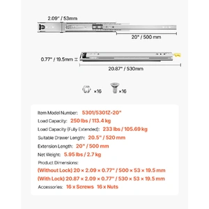 You can get 1 pair of drawer slides with lock: 20.87 inches/530 mm long, 2.09 inches/53 mm wide, 0.77 inches/19.5 mm thick. With 3-fold full extension design, you can reach the whole drawer. It is a good assistant for utilizing drawer space!