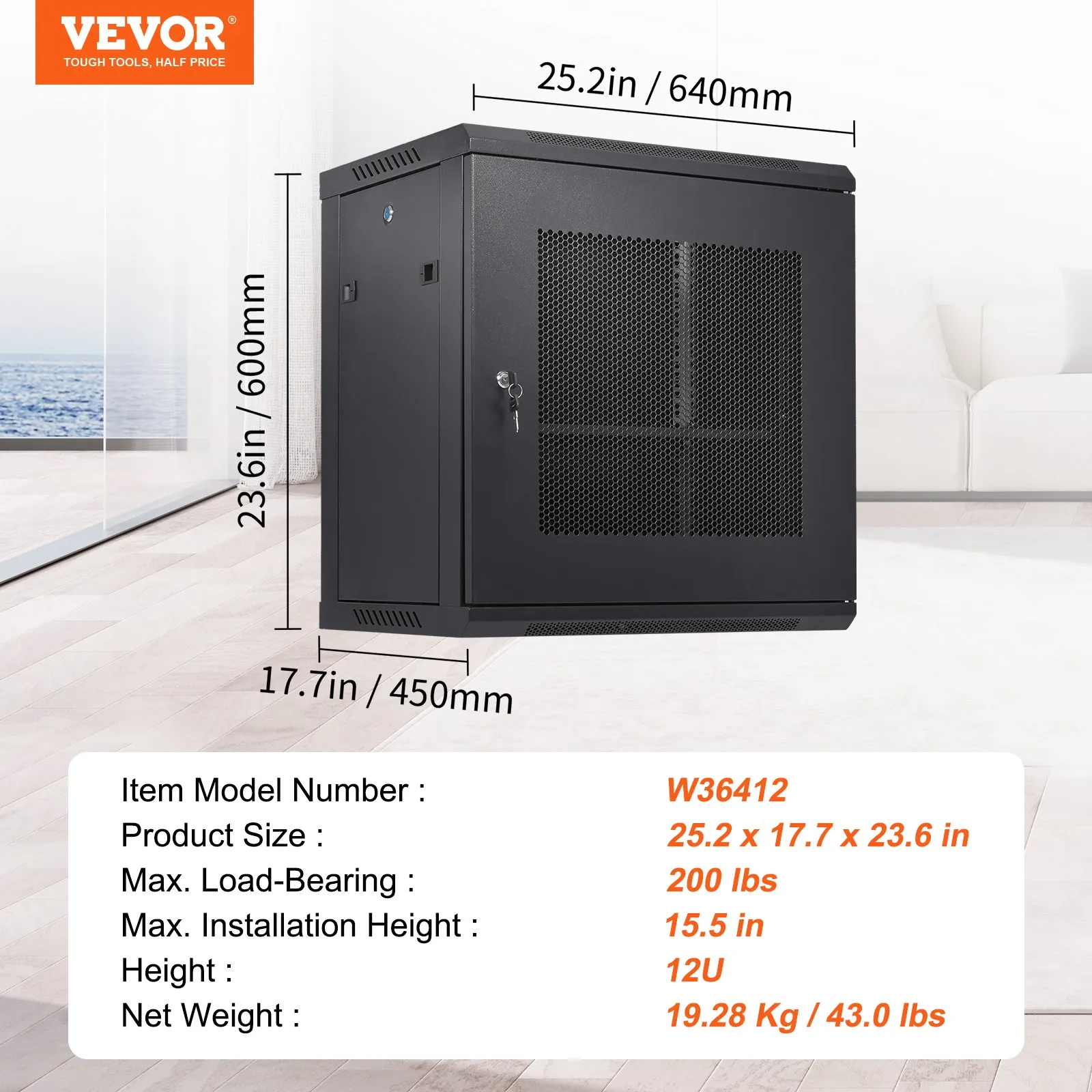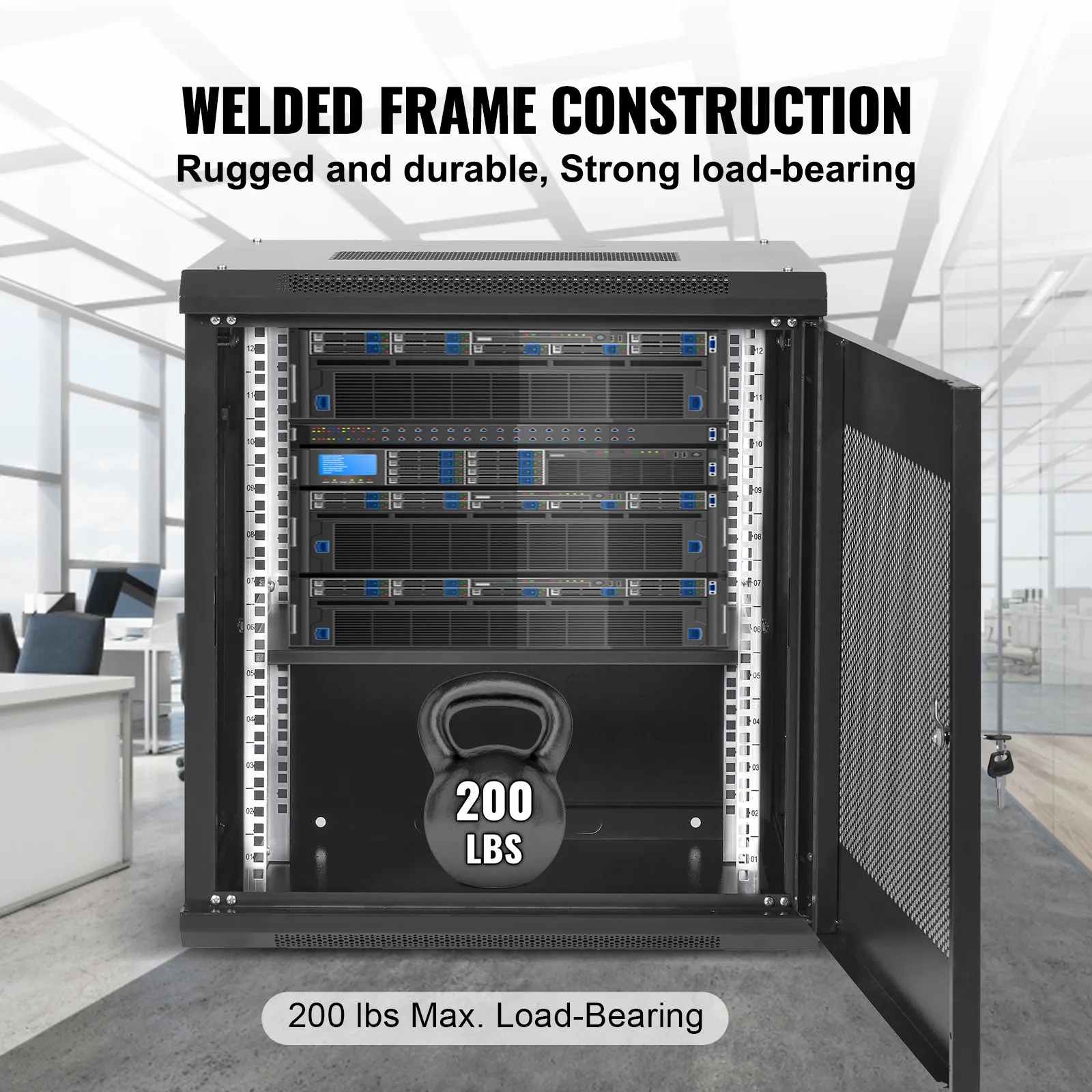Robust welded frame construction for durability and long service life. With 100 lbs wall-mounted load capacity and 200 lbs ground-mounted load capacity, you can place multiple devices in the server rack cabinet as needed.