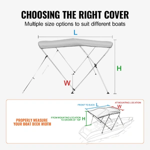 The boat bimini top cover is available in various sizes. This boat bimini top cover dimensions are 3 Bow 6'L X 46" H X 67"-72" W. To choose the right size, measure the width of your boat's deck. It's designed to fit the most commonly available boat types in the market, making your purchase hassle-free.