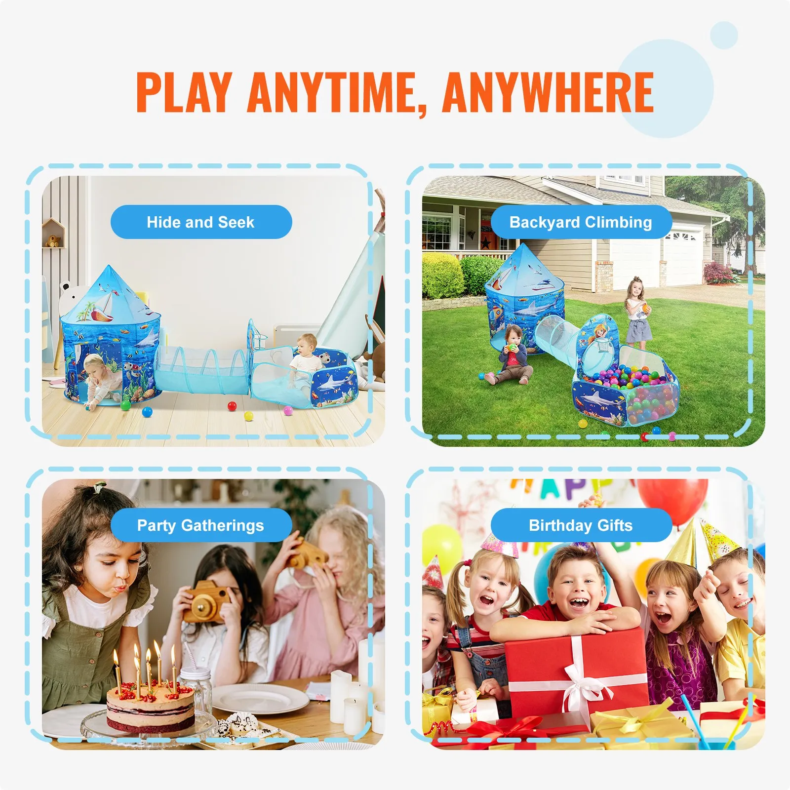 This tent tunnel can be used indoors or in the yard, and it's great for children's parties, creating an entertainment space for kids. It's also an ideal creative gift for children on occasions like birthdays, Christmas, Thanksgiving, Halloween, and New Year's.